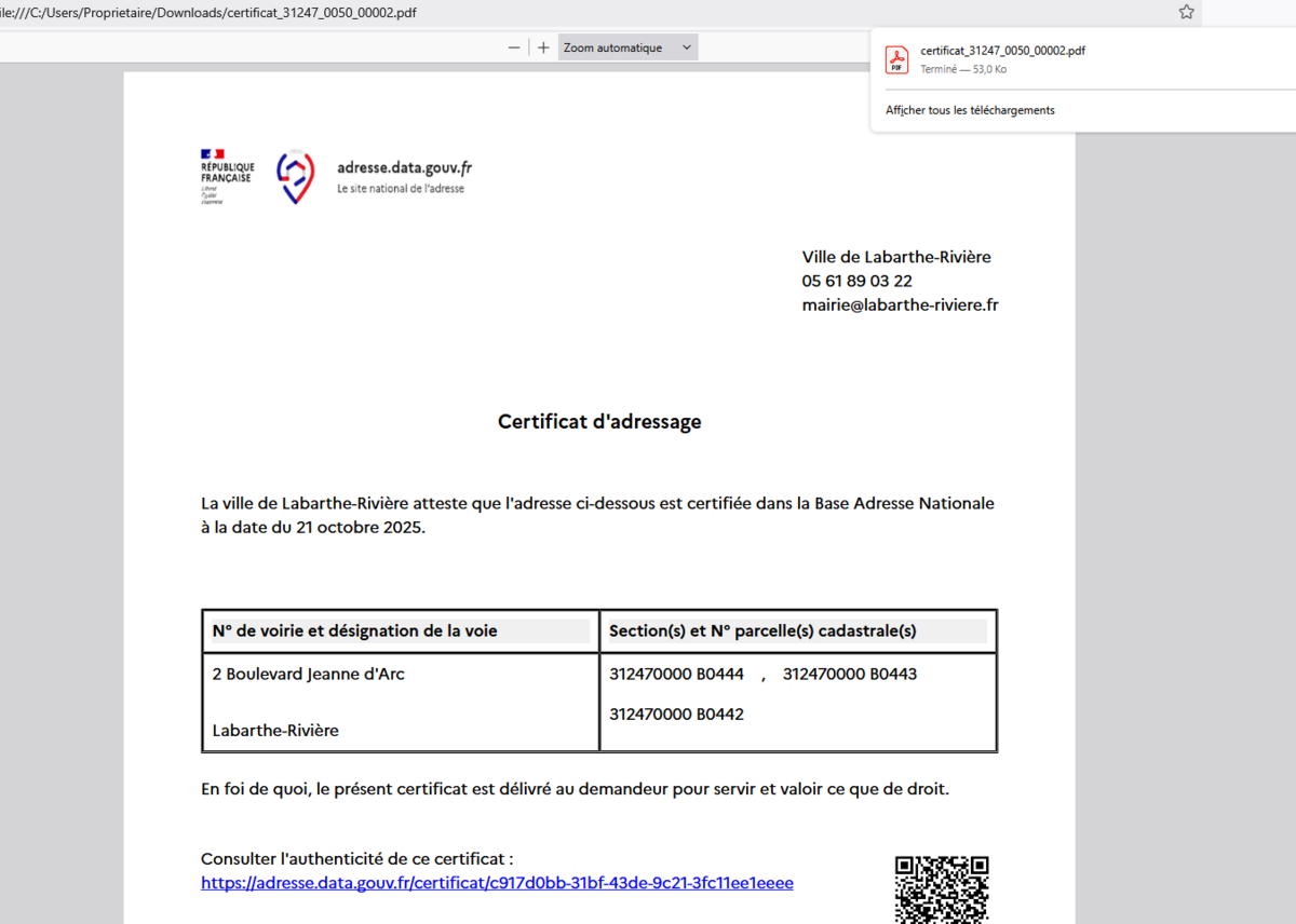 Obtenir un certificat d'adressage en ligne