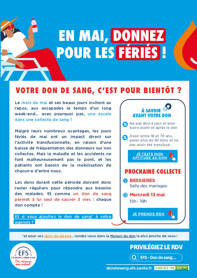 Nous vous informons qu’une nouvelle collecte de sang est organisée le mercredi 13 mai 2026 à Bessières.