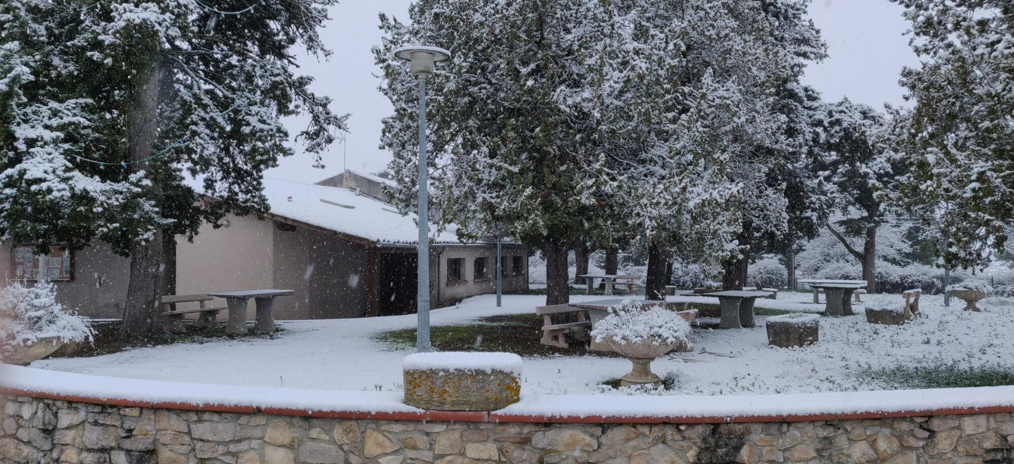 Un espace accueillant et calme sur la place du village à l'ombre des arbres avec des tables et banc.