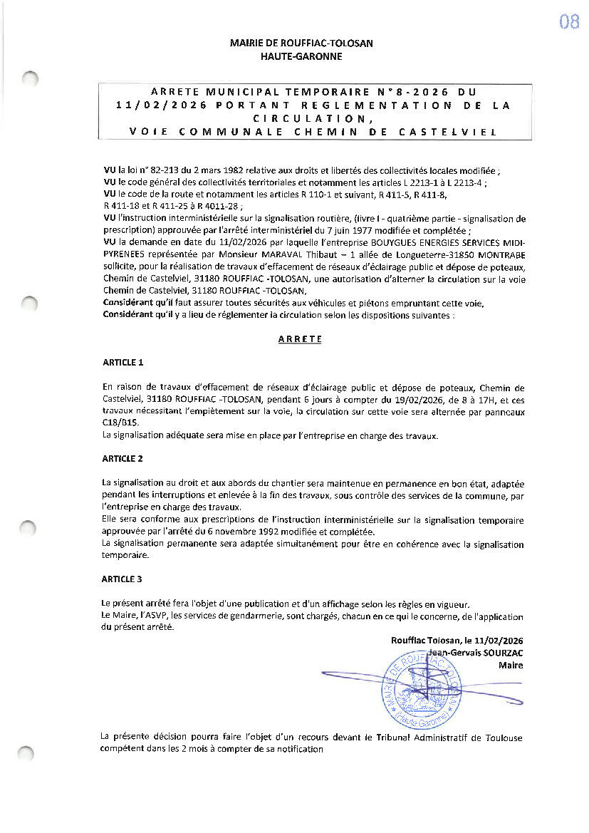 La Mairie vous informe que des travaux auront lieu Chemin de Castelviel du 19 au 24/02/2026.