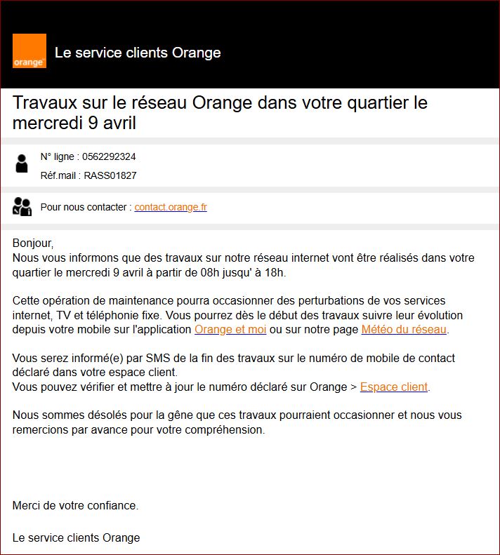 Travaux sur le réseau Orange 7/4/25 Travaux sur le réseau Orange dans votre quartier le mercredi 9 avril 2025