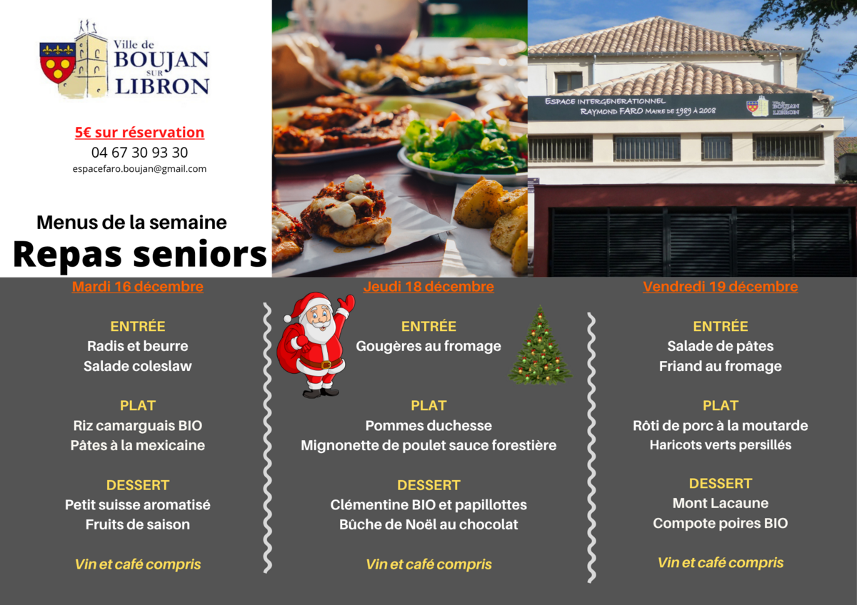 Menus des repas sรฉniors du ๐ฆ๐๐ซ๐๐ข 16, ๐ฃ๐๐ฎ๐๐ข 18 ๐๐ญ ๐ฏ๐๐ง๐๐ซ๐๐๐ข 19 ๐๐ฬ๐๐๐ฆ๐๐ซ๐ ๐๐๐๐