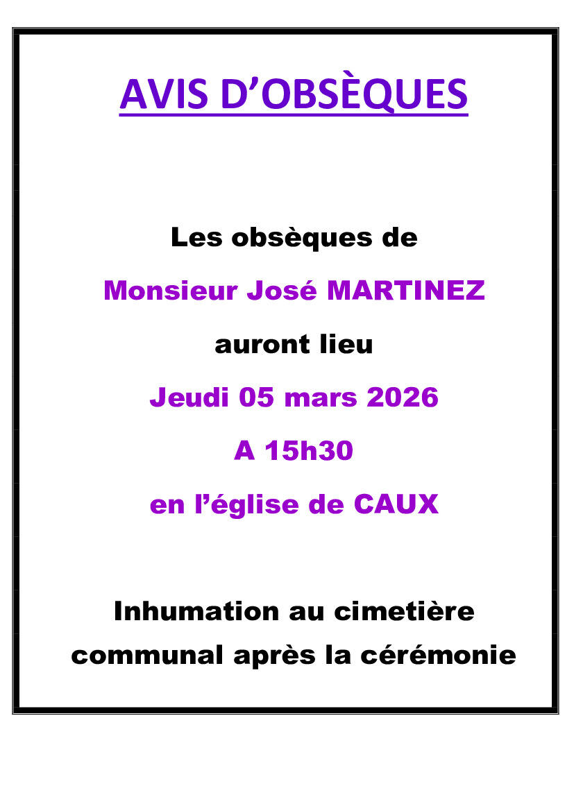 Avis d'obsèques à Caux. Jeudi 5 mars à 15h30