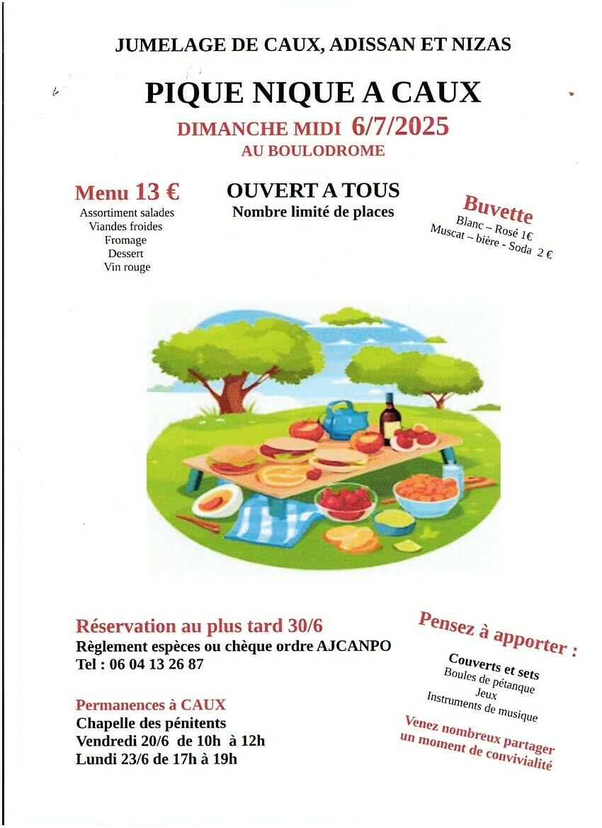 L'"association de Jumelage de Caux, Adissan et Nizas en Pays d'Oc" organise un pique-nique ouvert à tous dimanche 6 juillet à midi à CAUX, complexe Jacques Vailhère (boulodrome).
