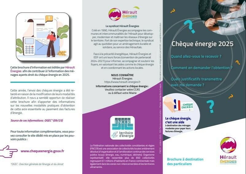 Dans le cadre de la campagne 2025 du chèque énergie, Hérault Énergies transmet une brochure d’information.
