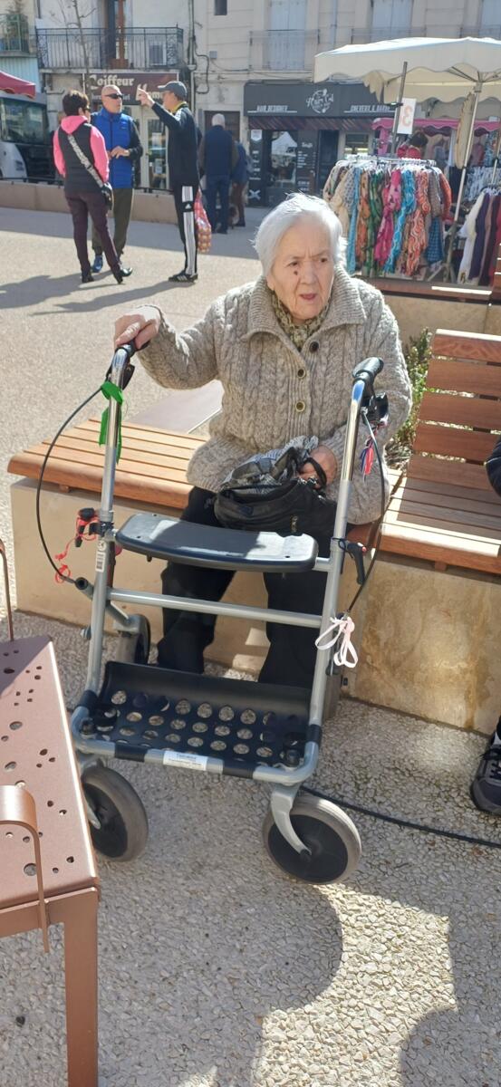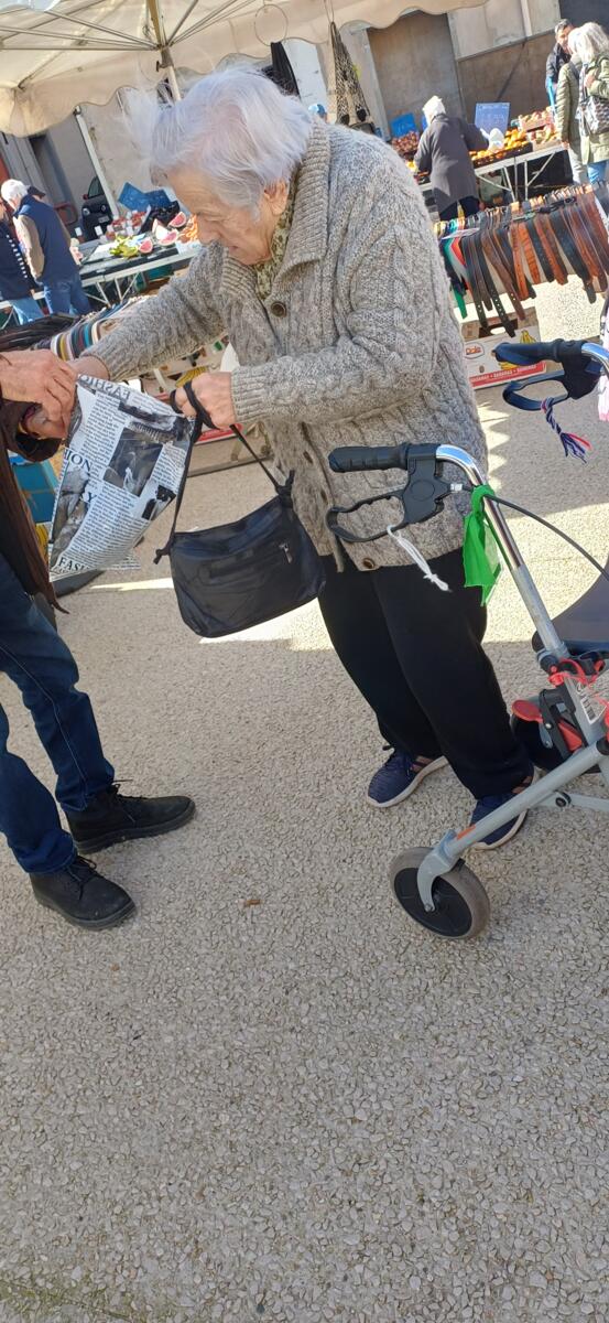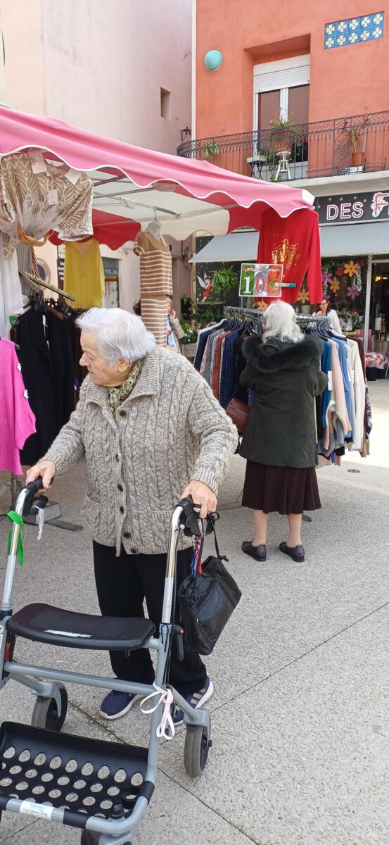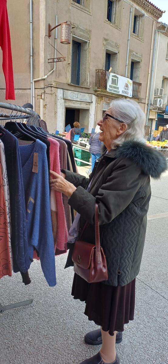 Jeudi, le soleil a fait son apparition alors, nous en avons profité pour faire un tour au marché. Madame S.  a pris du plaisir a fouiller dans les portiques des marchants de vêtements et madame G; a acheté un beau foulard. Elles ont rencontré des personnes qu'elles côtoyaient auparavant et ont discuté ensemble. Des gestes simples qui permettent à chacune de se sentir autonome.