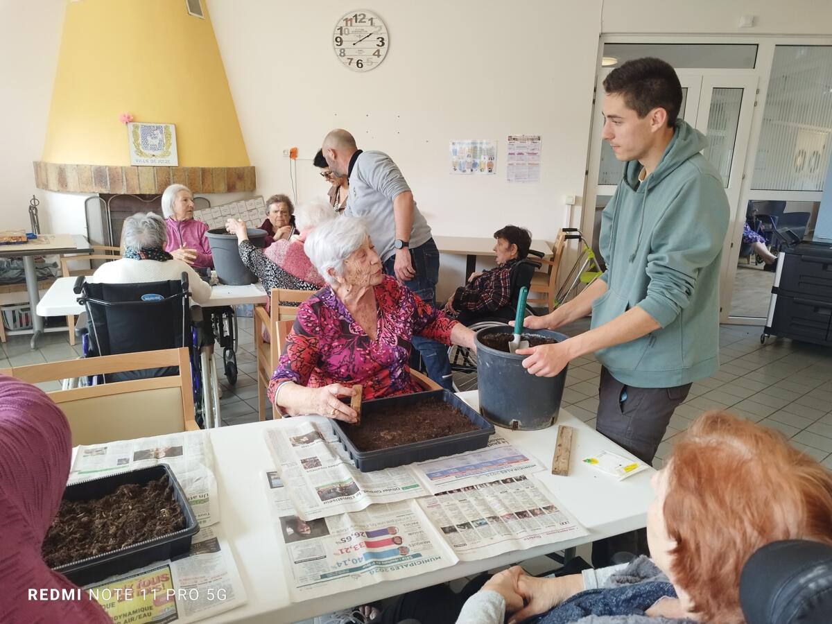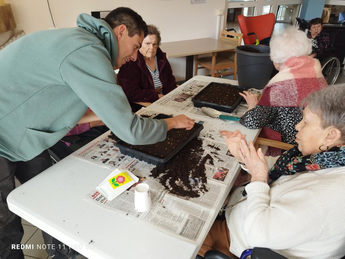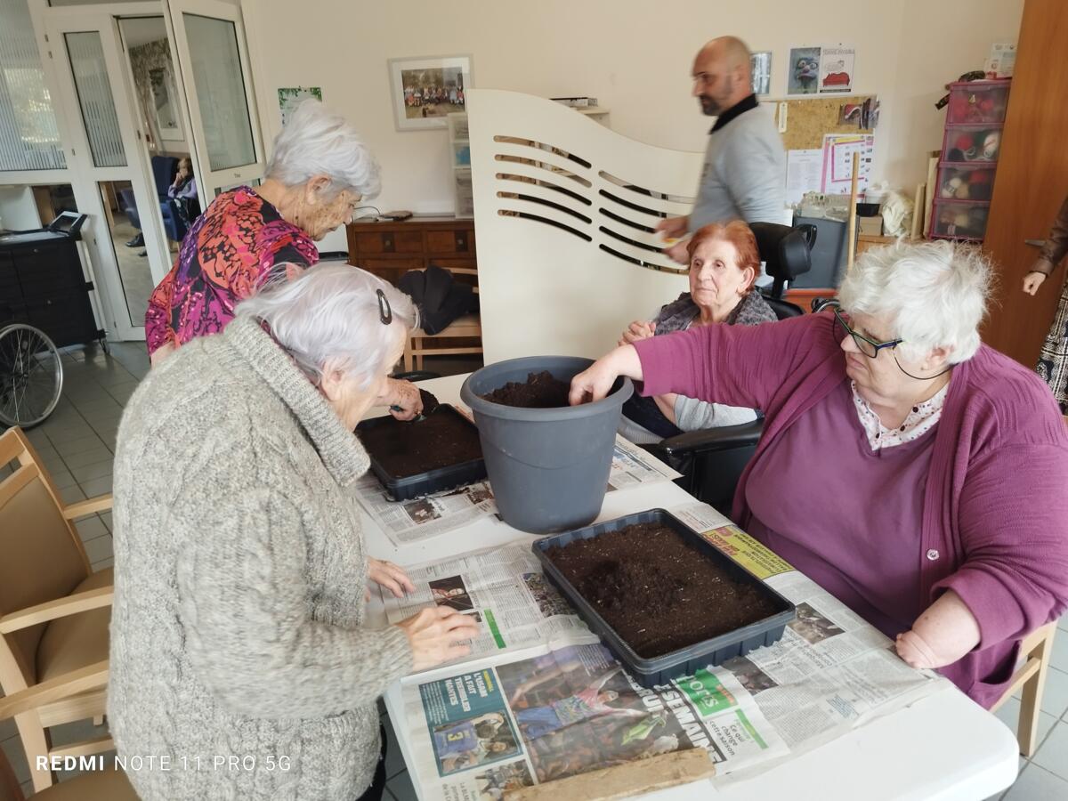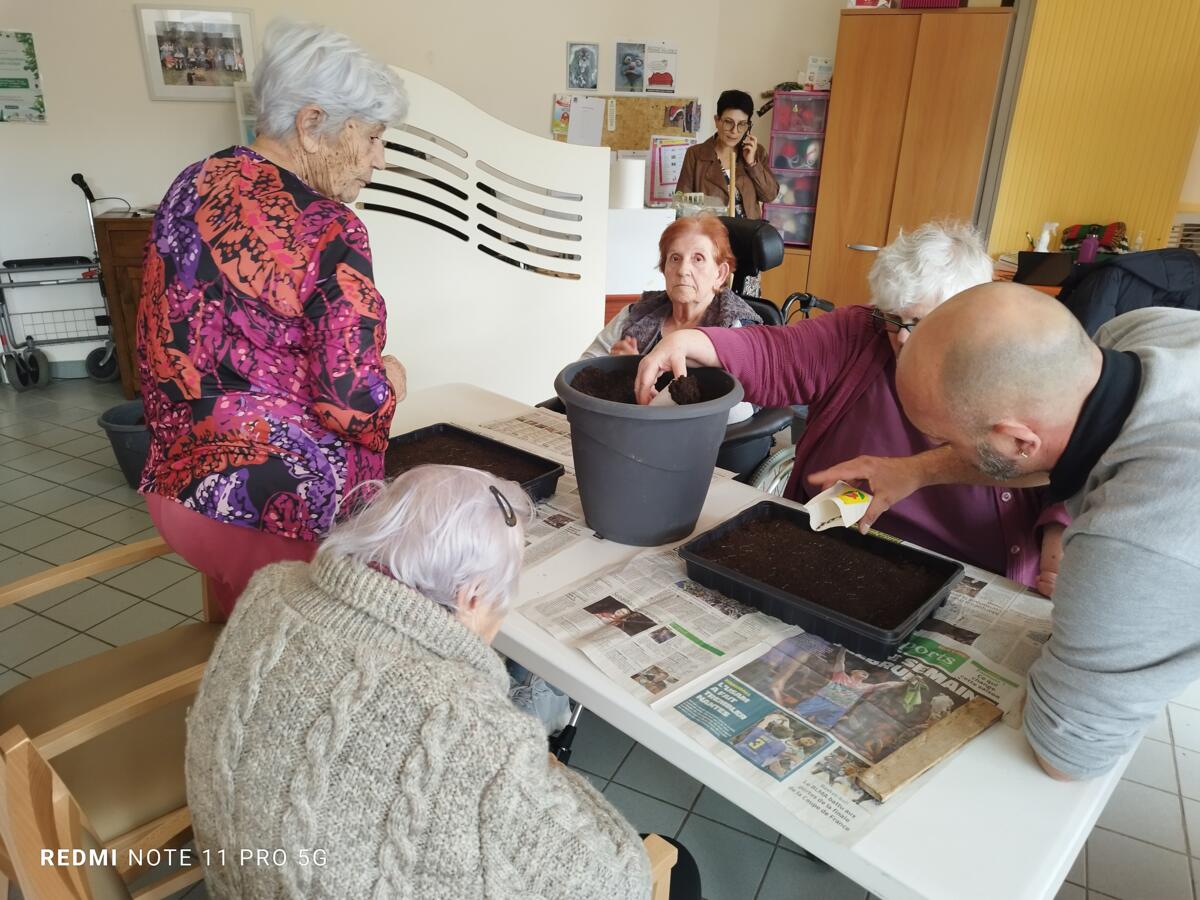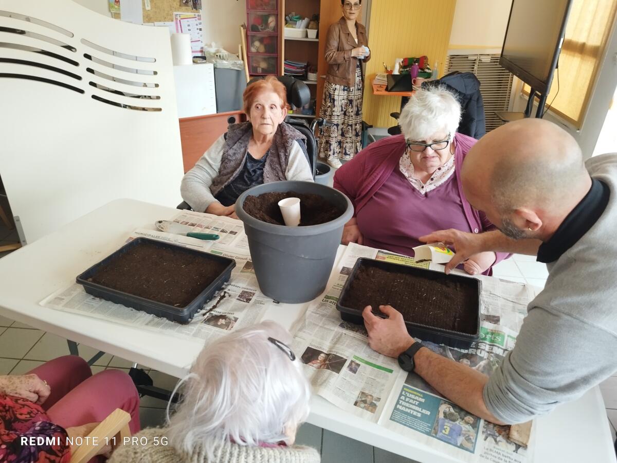 Avec les beaux jours qui arrivent et l'envie de voir de la couleur dans le jardin, nous avons fait appel à Yann, jardinier de la ville pour nous aider à faire des semis. Il a expliqué aux résidents, très attentifs, le procédé et le devenir des graines. Une belle réussite, nous ne manquerons pas de vous montrer l'évolution des graines.