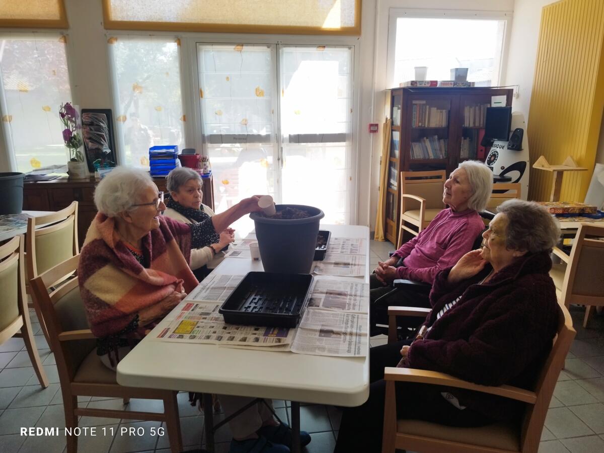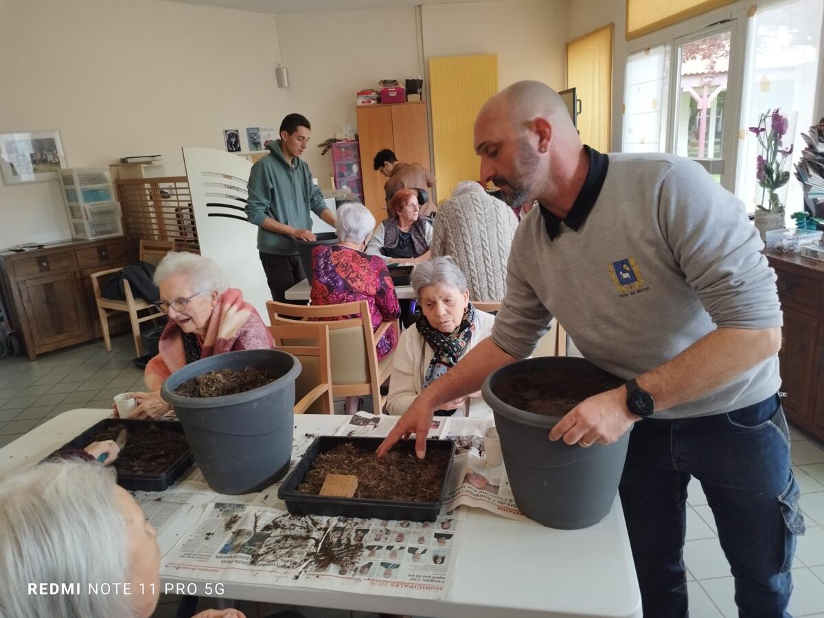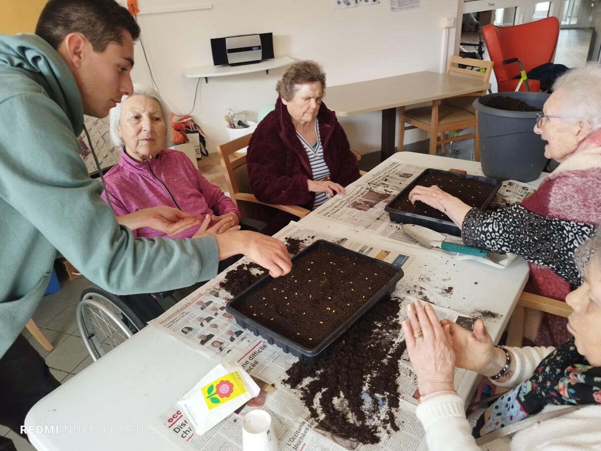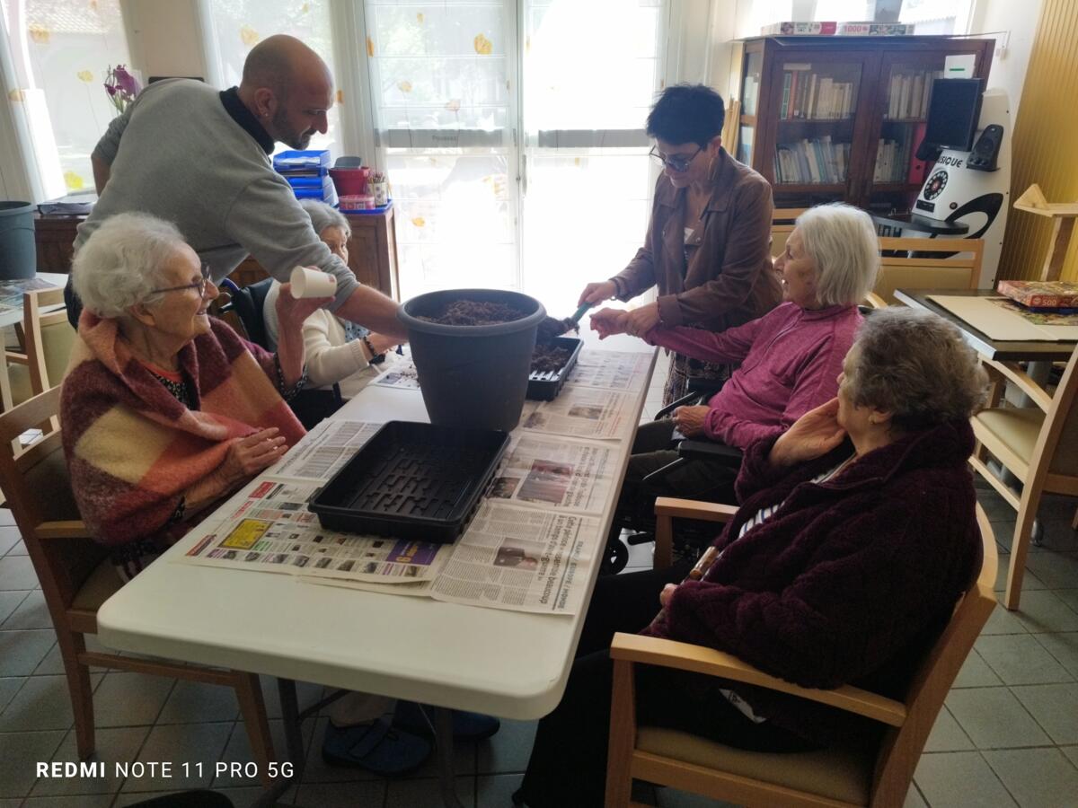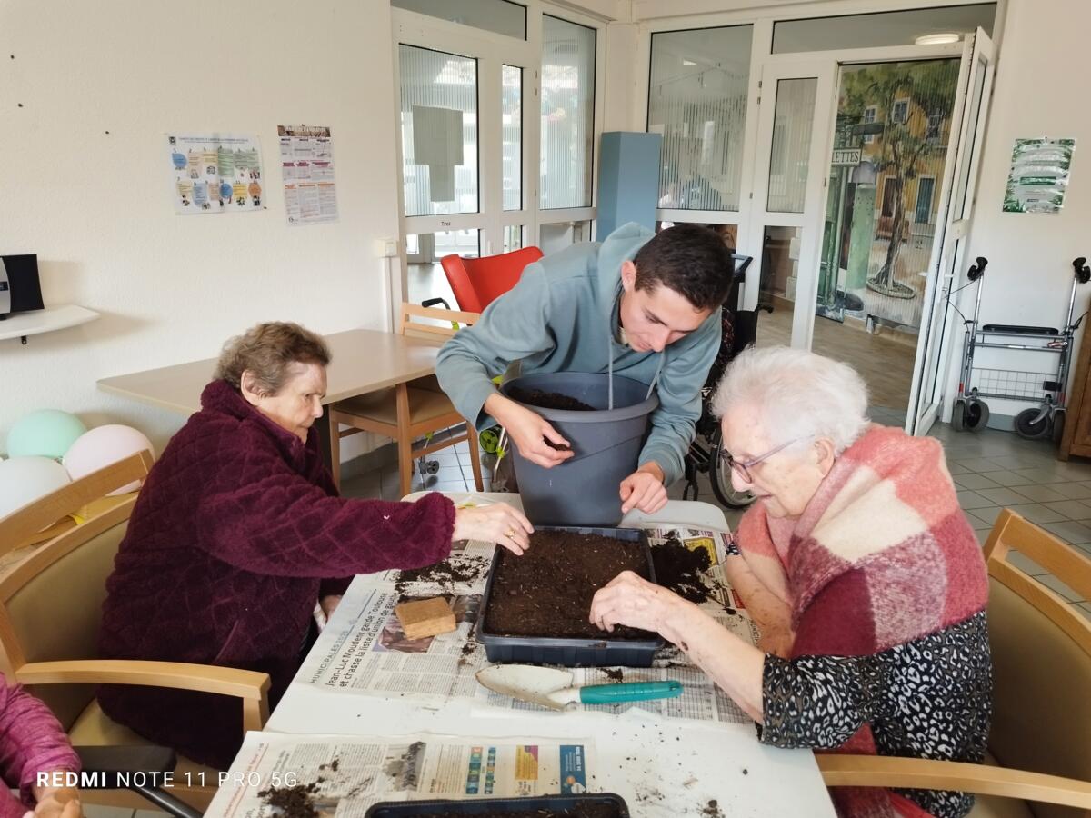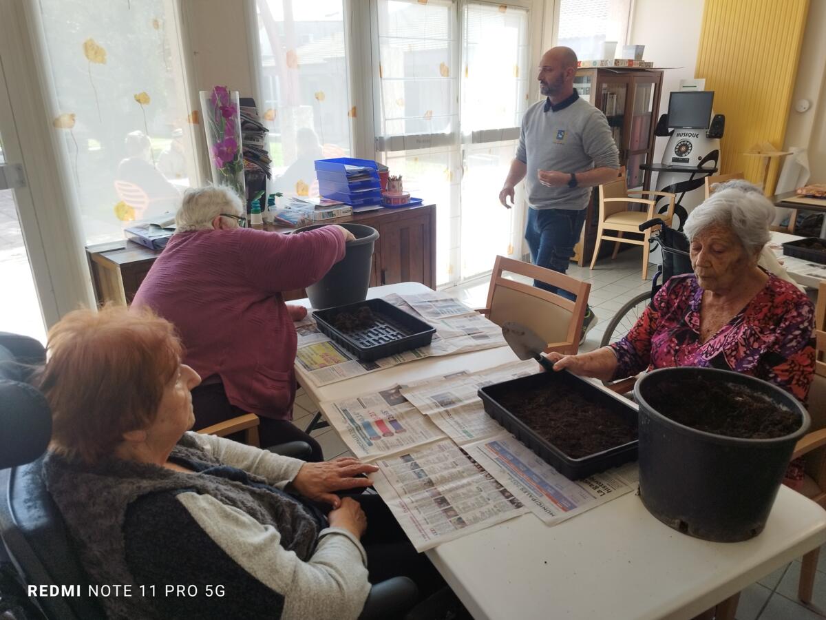 Avec les beaux jours qui arrivent et l'envie de voir de la couleur dans le jardin, nous avons fait appel à Yann, jardinier de la ville pour nous aider à faire des semis. Il a expliqué aux résidents, très attentifs, le procédé et le devenir des graines. Une belle réussite, nous ne manquerons pas de vous montrer l'évolution des graines.