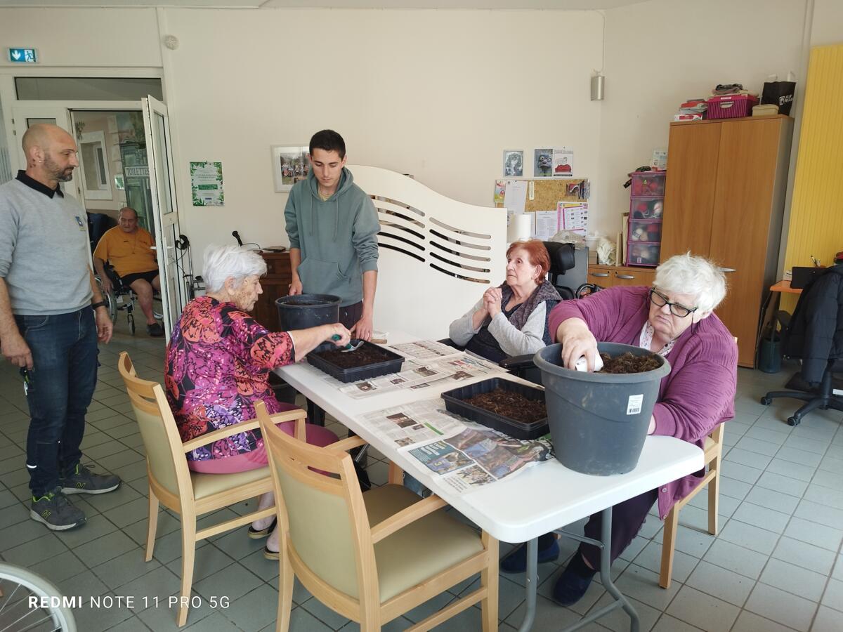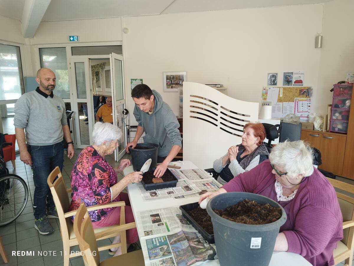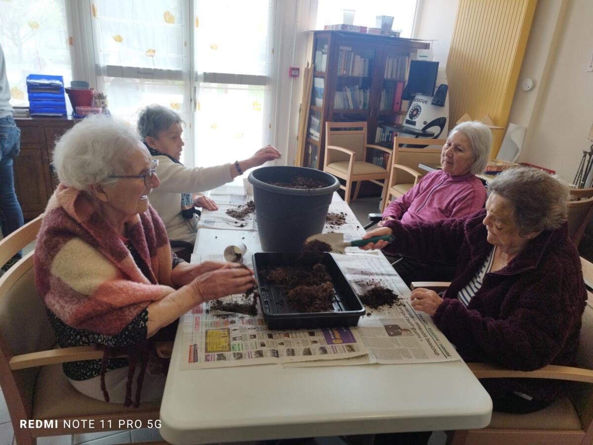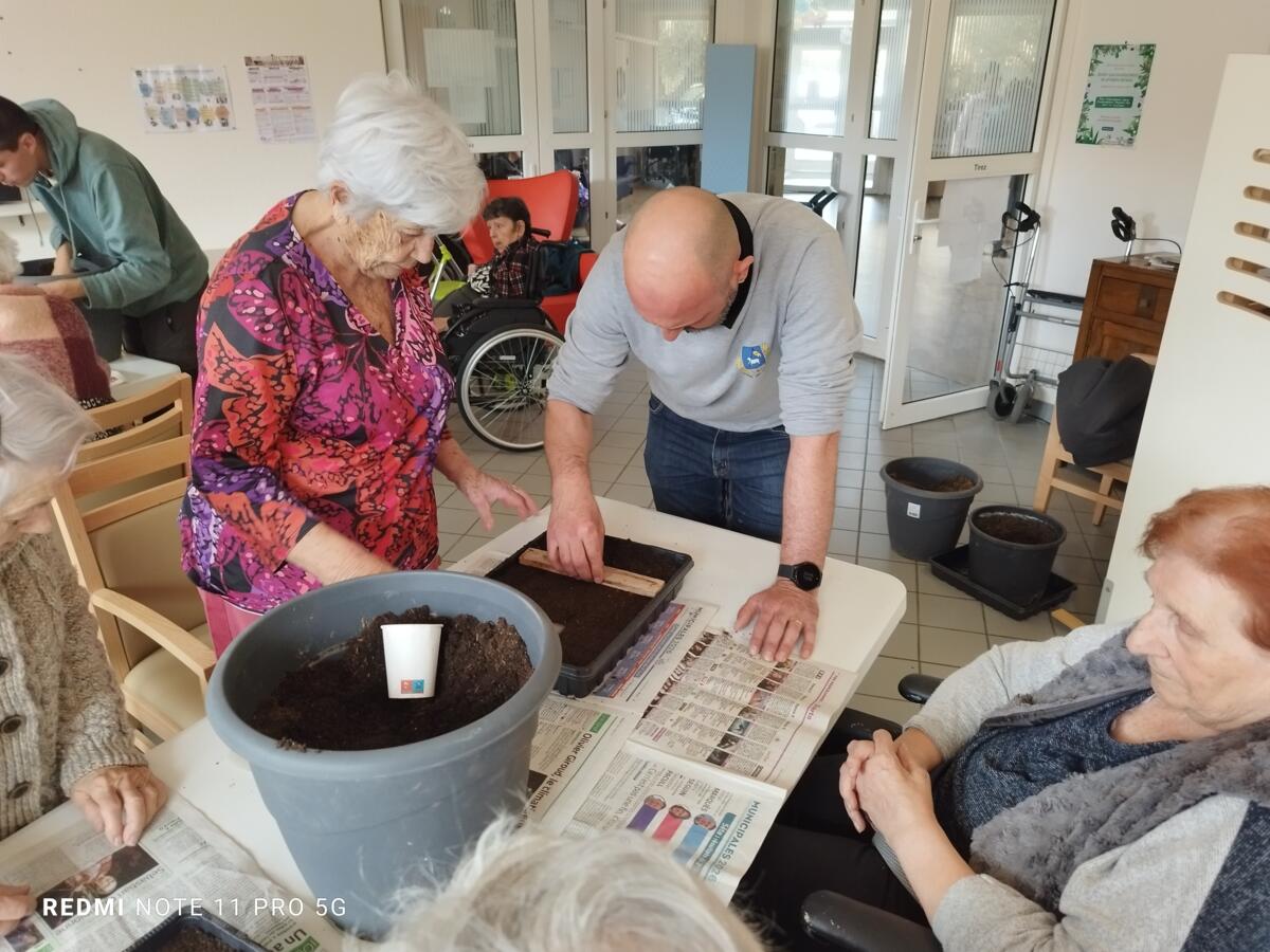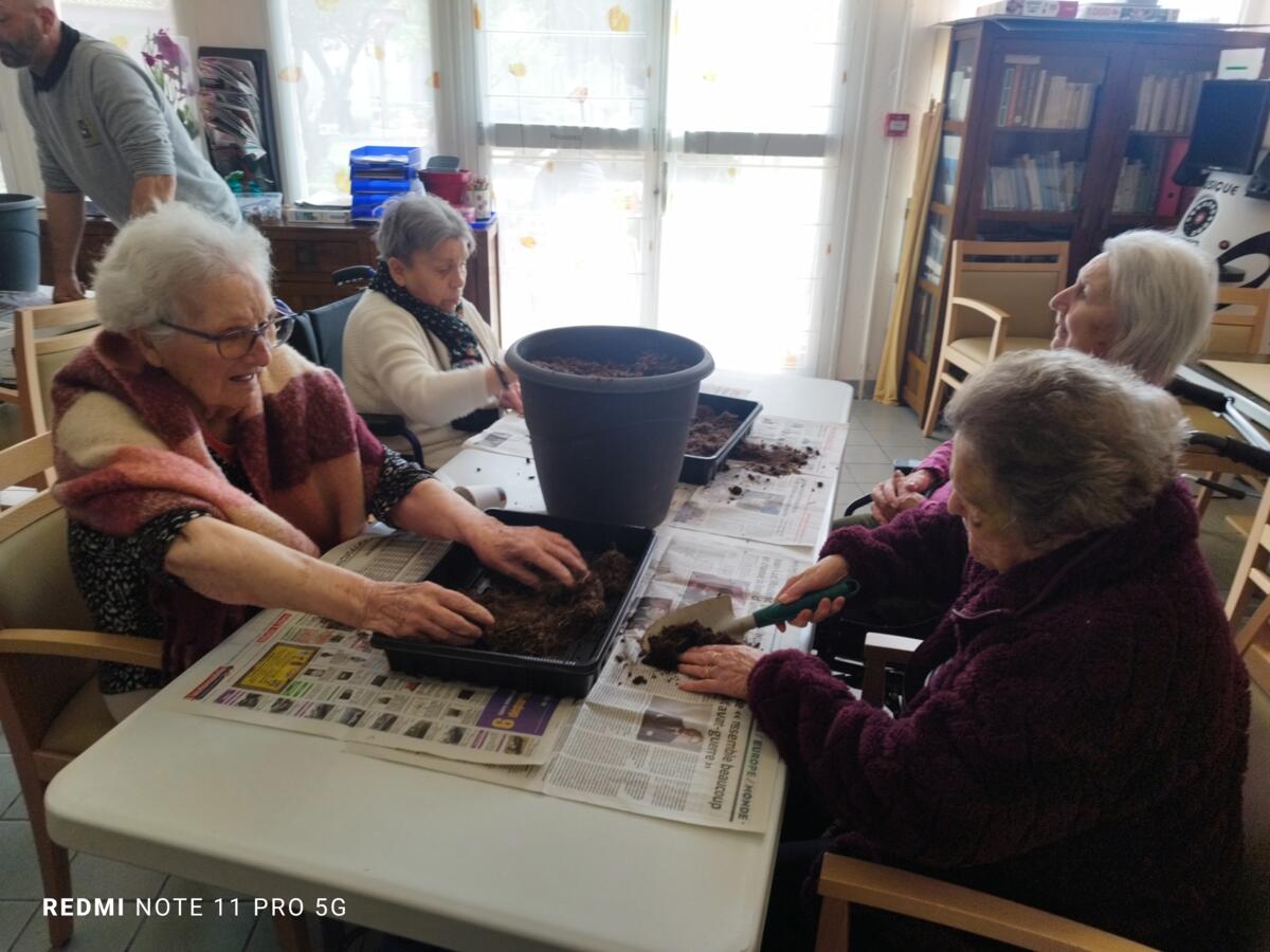 Avec les beaux jours qui arrivent et l'envie de voir de la couleur dans le jardin, nous avons fait appel à Yann, jardinier de la ville pour nous aider à faire des semis. Il a expliqué aux résidents, très attentifs, le procédé et le devenir des graines. Une belle réussite, nous ne manquerons pas de vous montrer l'évolution des graines.