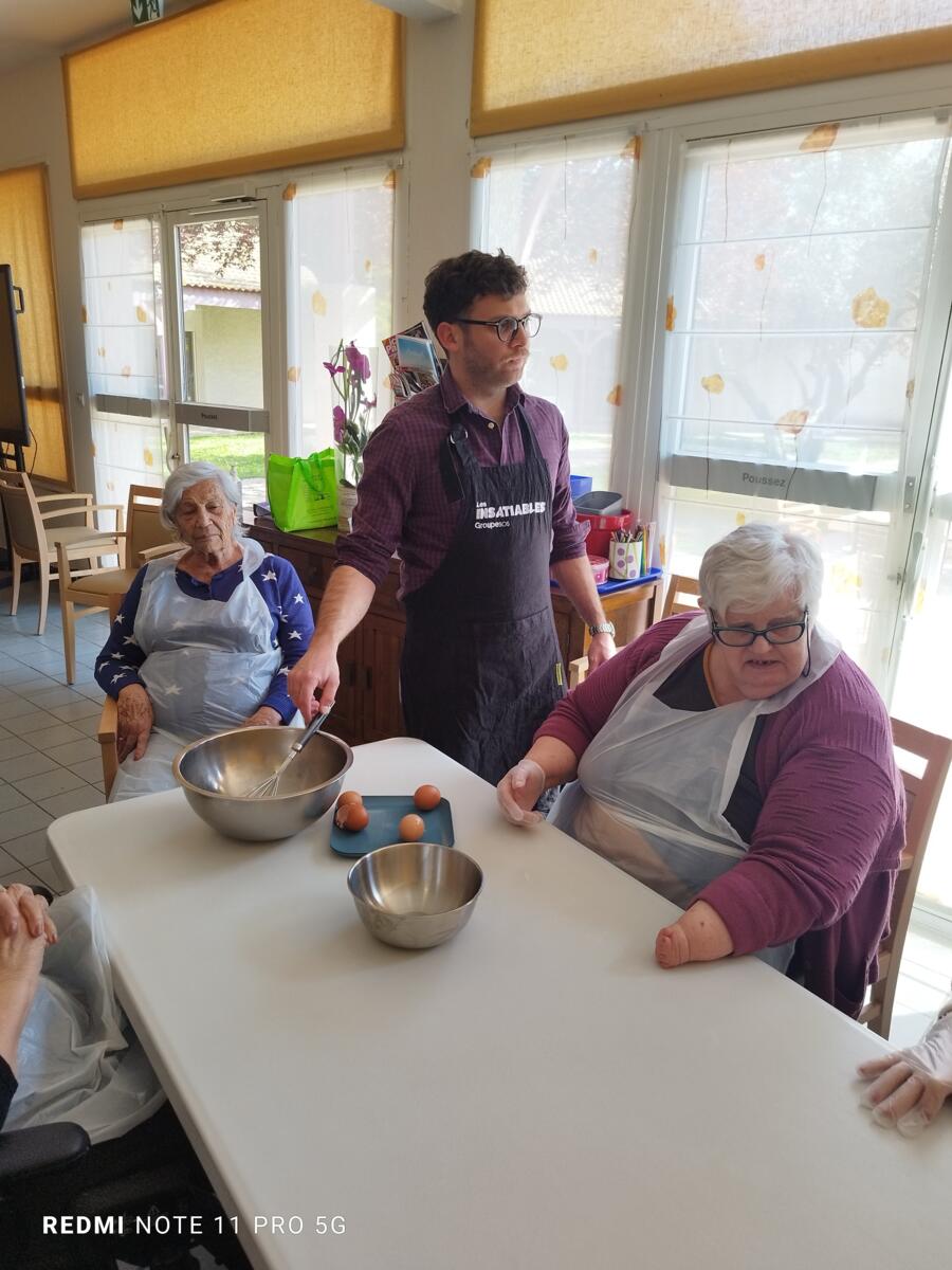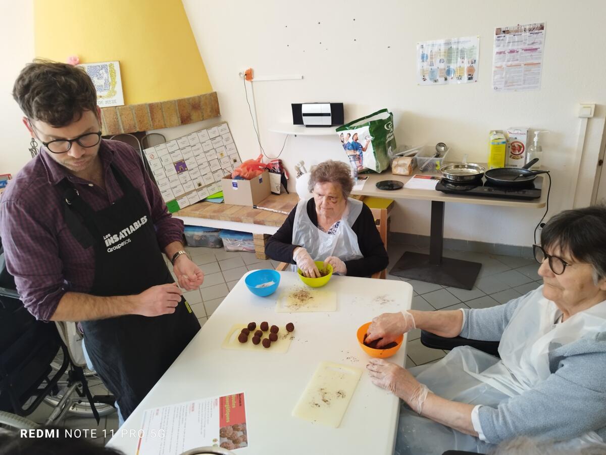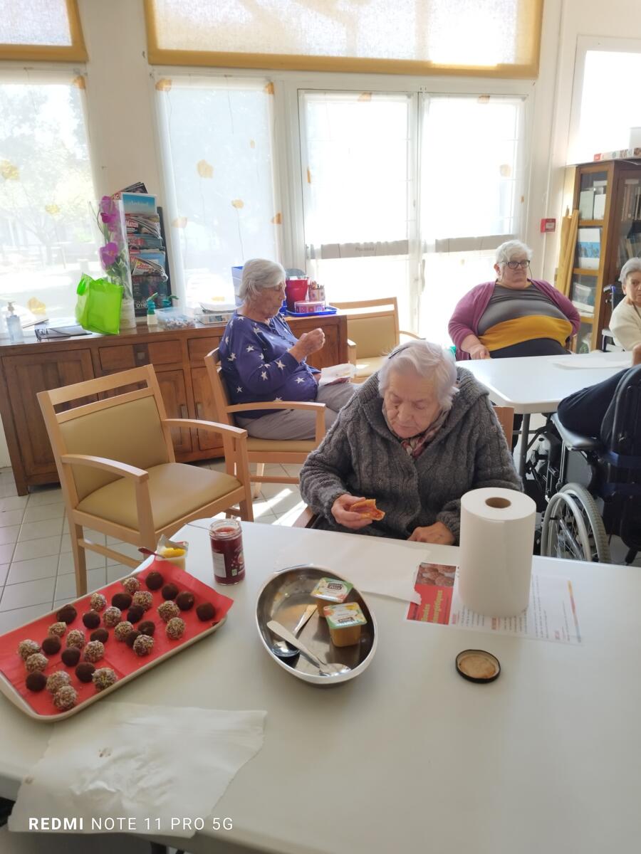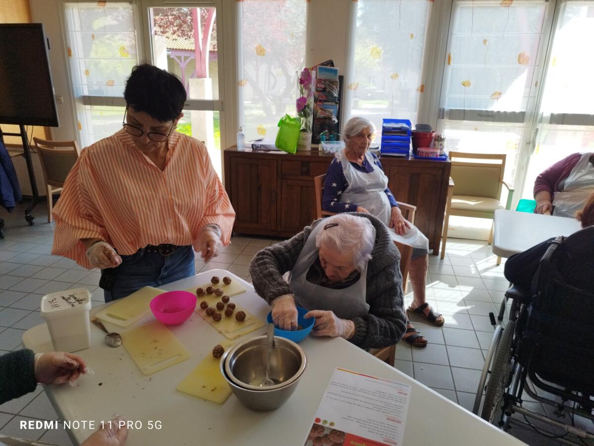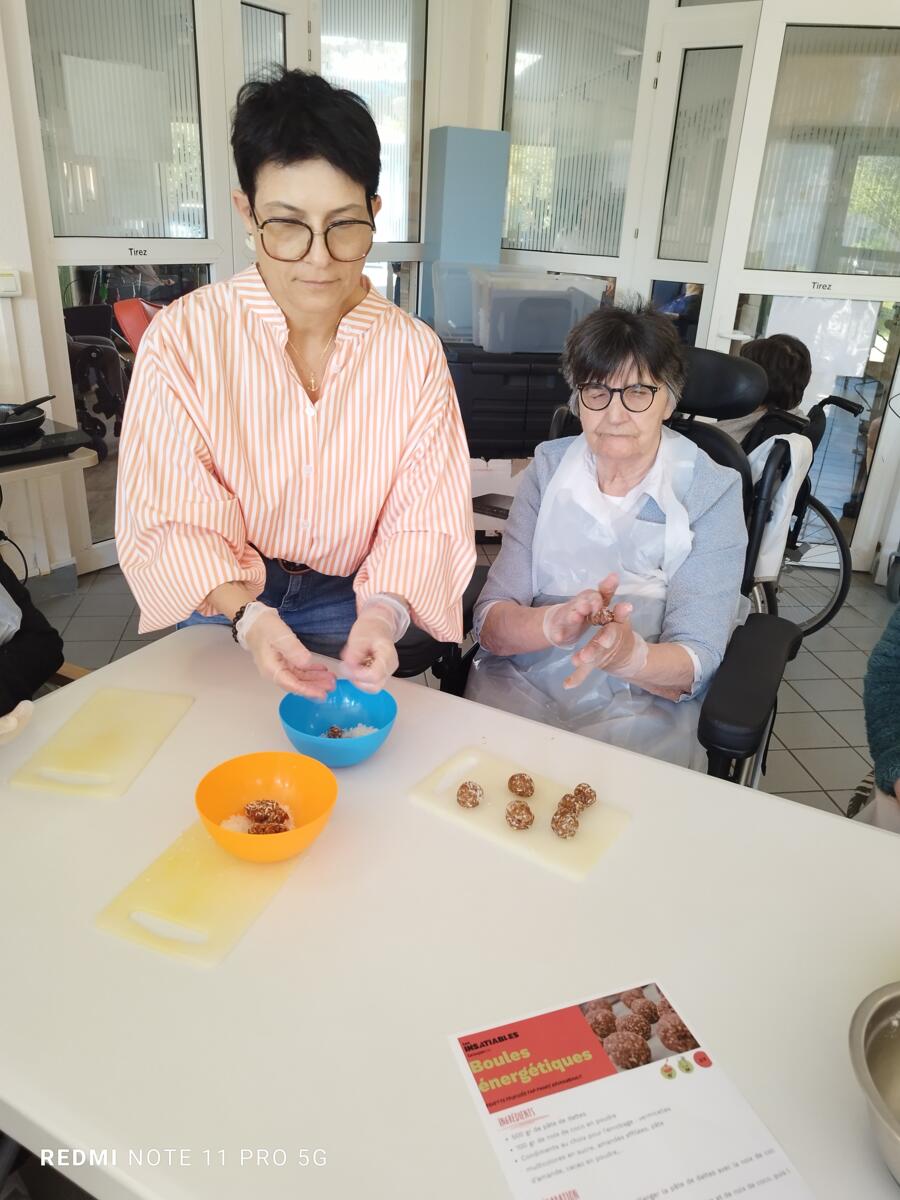 L'après-midi, une nutritionniste est venue expliquer et proposer deux recettes simples aux résidents en lien avec le projet "les insatiables" Ils ont pu préparer et déguster des boules énergétiques et des pancakes. Une journée appréciée de tous et qui a connu un vif succès. C'est certain, nous le referons.