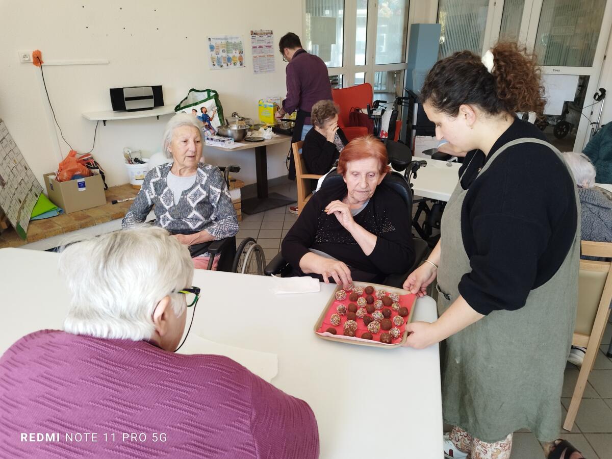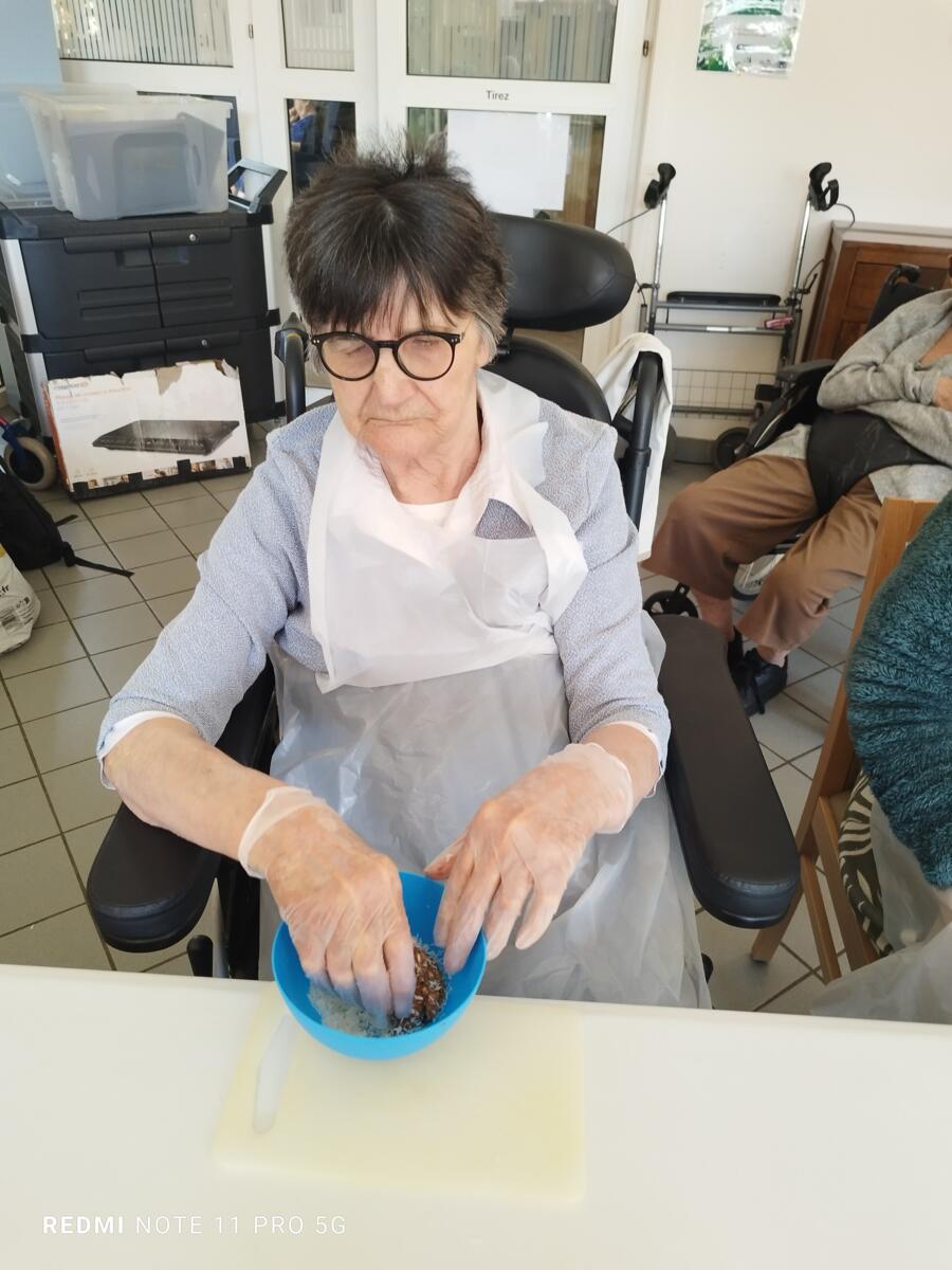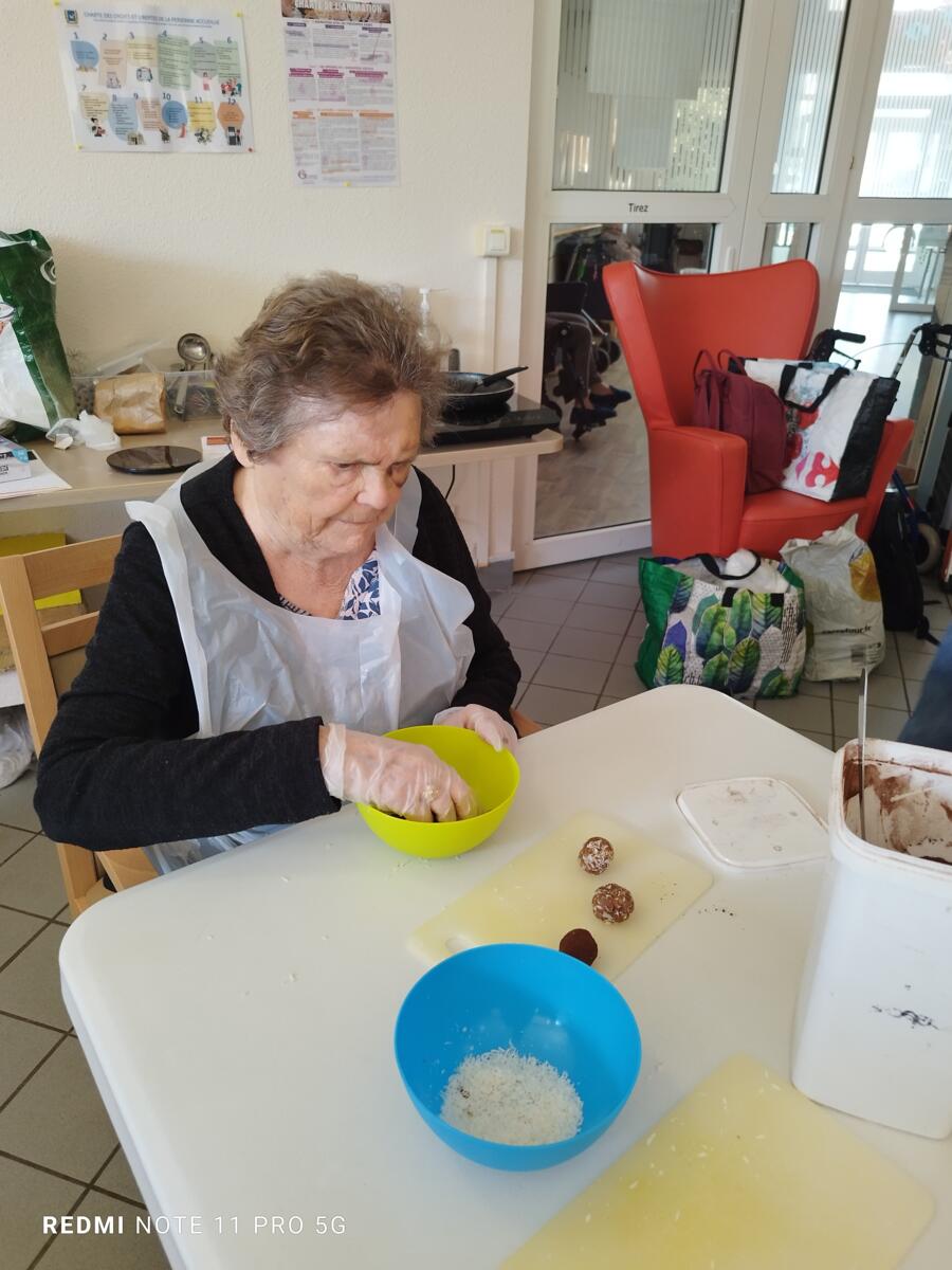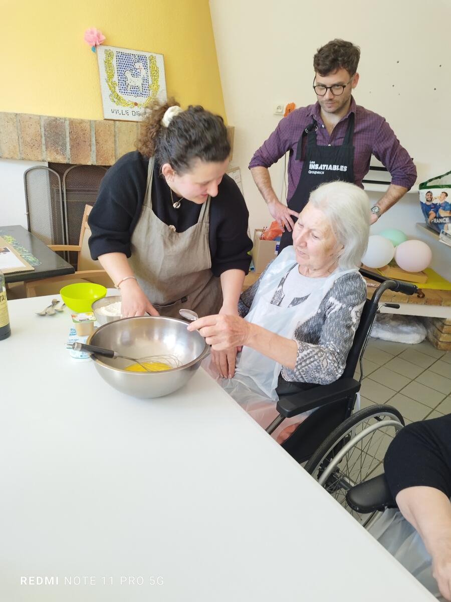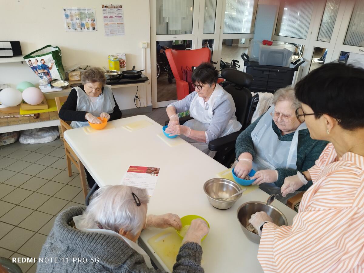 L'après-midi, une nutritionniste est venue expliquer et proposer deux recettes simples aux résidents en lien avec le projet "les insatiables" Ils ont pu préparer et déguster des boules énergétiques et des pancakes. Une journée appréciée de tous et qui a connu un vif succès. C'est certain, nous le referons.