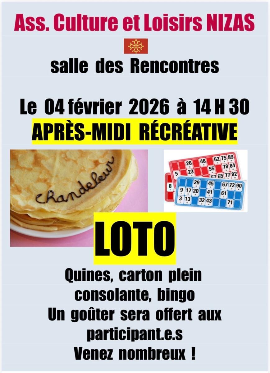 Loto culture et loisirs 29/1/26 Association culture et loisirs vous propose son LOTO le mercredi 04 février à 14h30 à la SdR. Venez nombreux