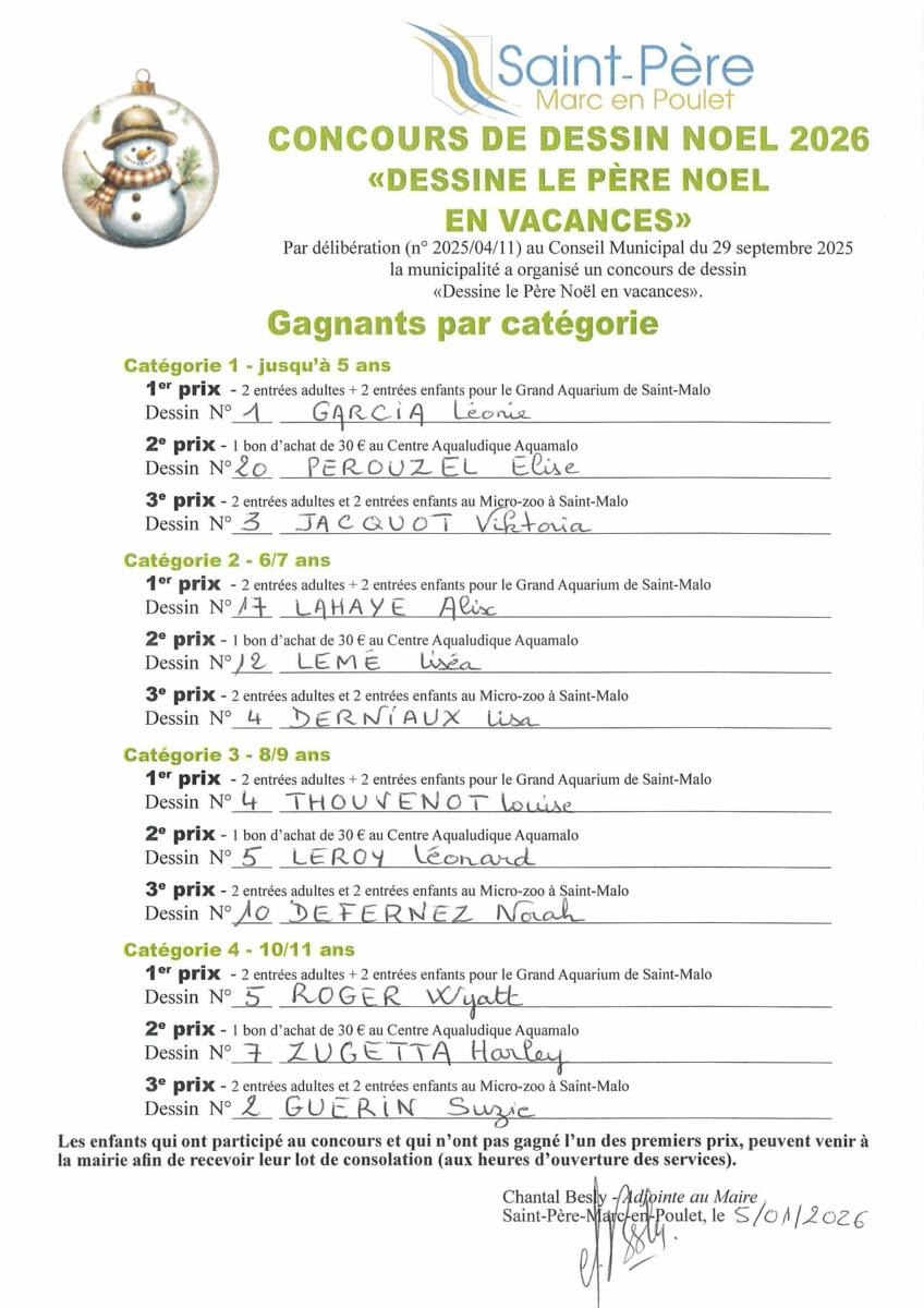 Les enfants qui ont participé au concours et qui n'ont pas gagné l'un des premiers prix, peuvent venir en mairie afin de recevoir leur LOT de CONSOLATION.