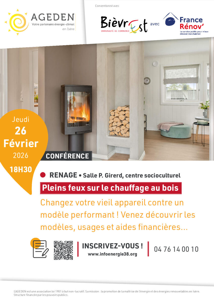 🔥 Conférence "Pleins feux sur le chauffage au bois" 📅Jeudi 26 Février 2026 🕡18h30 📍Renage – Salle P. Girerd, centre socioculturel On vous dit tout sur le chauffage au bois : avantages, inconvénients, bonnes pratiques, entretien et aides financières. ✅Gratuit – Sur inscription 👥 Réservé aux habitant·es de la communauté de communes Bièvre Est 👉Inscrivez-vous sur infoenergie38.org