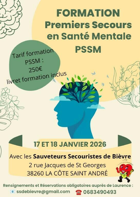 Les 17 et 18 janvier 2026, les Sauveteurs Secouristes de Bièvre ffss38 vous proposent une Formation Premiers Secours en Santé Mentale (PSSM), pensée pour celles et ceux qui souhaitent aider avec bienveillance et simplicité.
