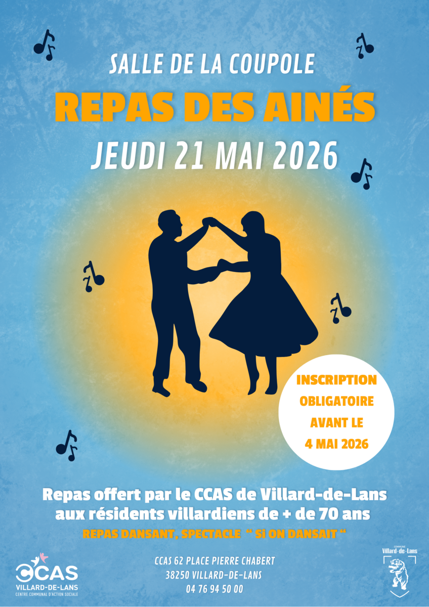 Le repas des ainés offert par le CCAS de Villard de Lans aux résidents villardiens de + de 70 ans , aura lieu le jeudi 21 mai 2026 à 12h salle de la Coupole .