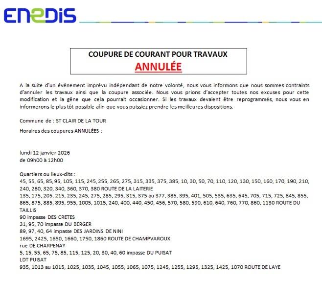 ENEDIS : coupure du 12/01/2026 annulée