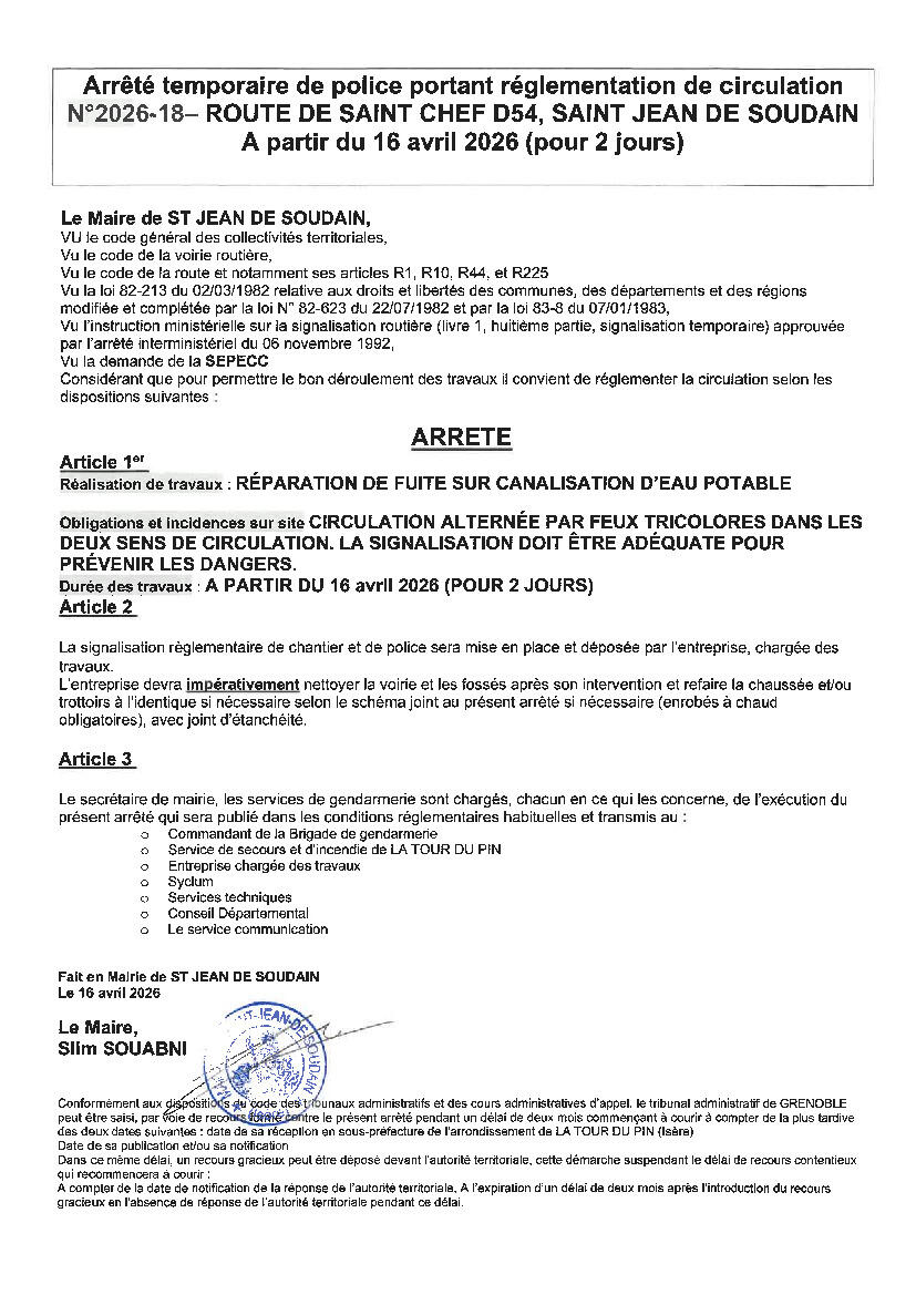 CIRCULATION ALTERNEE ROUTE DE ST CHEF 15/4/26 A partir du 16 avril (pour deux jours) pour réparation de fuite sur canalisation d'eau potable.