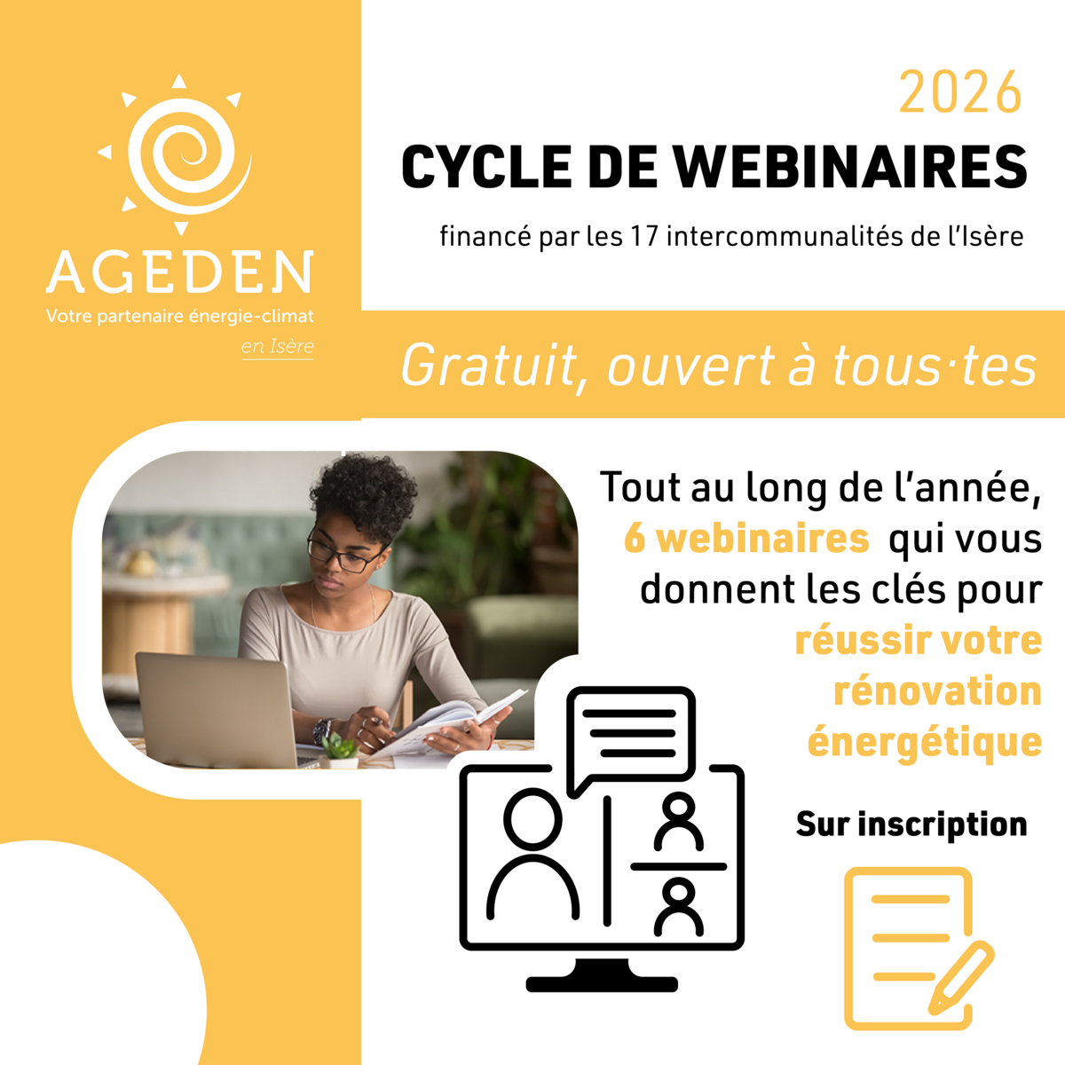 La rénovation énergétique n’est plus une option : c’est une opportunité pour améliorer votre confort et la valeur de votre logement. Tout au long de l’année 2026, une série de 6 webinaires gratuits vous donne les clés pour réussir votre rénovation énergétique, que vous viviez en maison individuelle ou en copropriété, en Isère. Destinées aux propriétaires occupants et bailleurs, ces sessions en ligne vous aideront à y voir clair sur les travaux à prévoir, les solutions techniques, les aides mobilisables et les bonnes pratiques pour gagner en confort et réduire vos factures. Des temps spécialement dédiés aux professionnels de la rénovation viendront aussi enrichir le programme. Un format accessible, concret et interactif pour passer à l’action, à votre rythme, depuis chez vous.