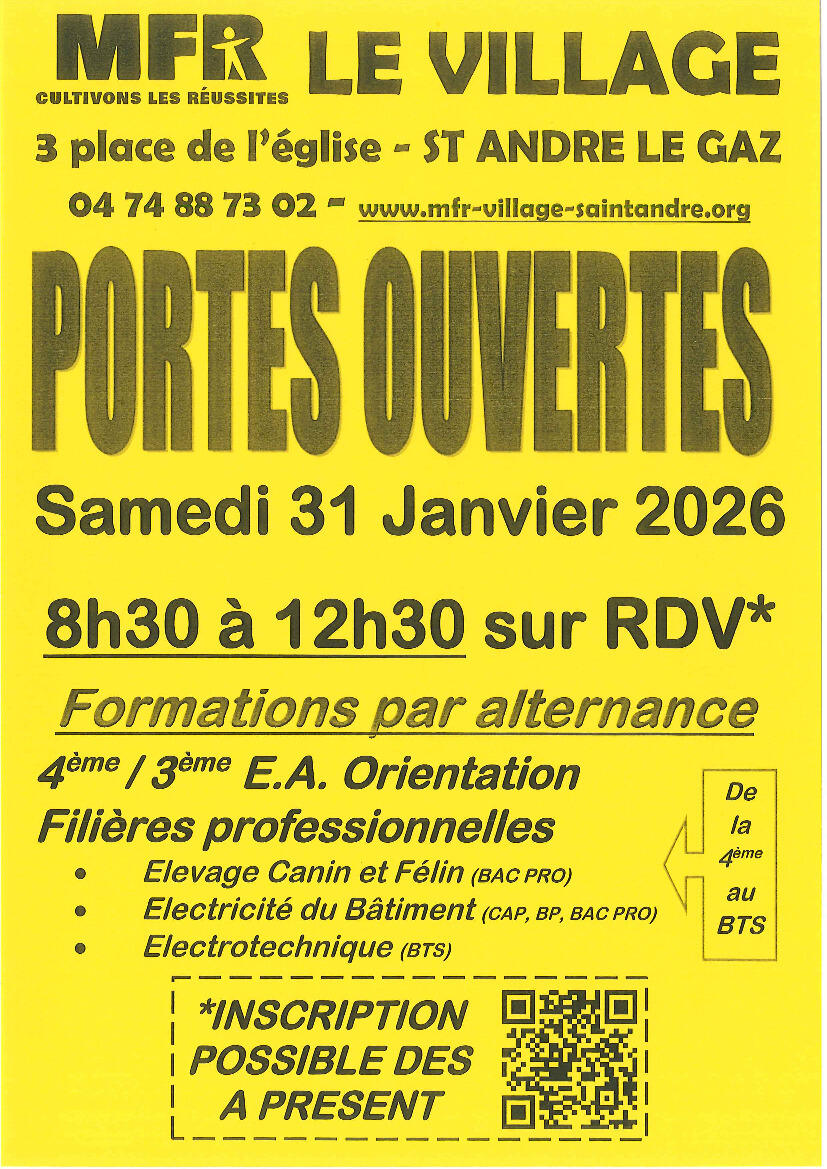 Portes ouvertes MFR 14/1/26 La MFR de Saint-André Le Gaz organise une journée portes ouvertes le samedi 31 janvier 2026.