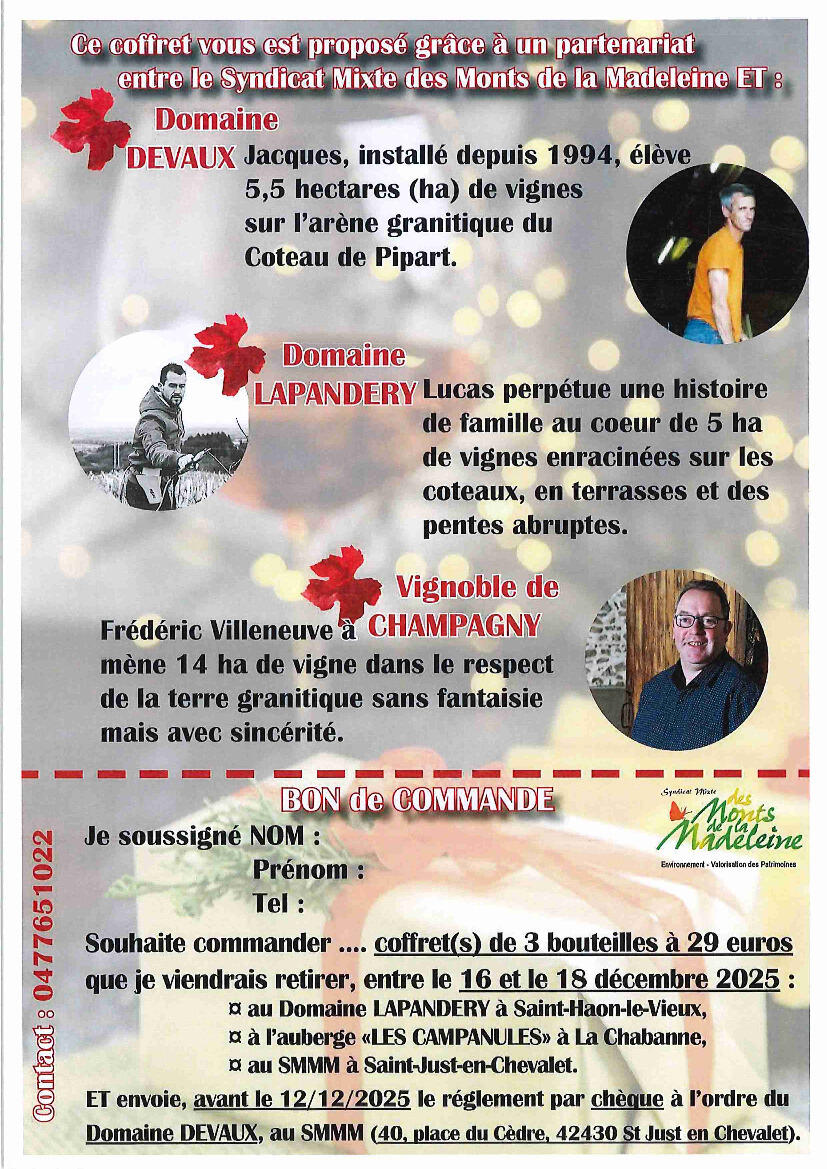 A l'approche des fêtes, le SMMM lance une quinzaine commerciale en partenariat avec 3 vignerons de Saint-Haon-le-Vieux, pour un beau coffret de vins produits en Côte Roannaise !