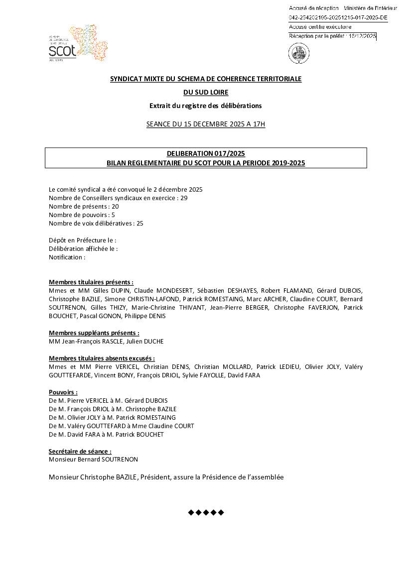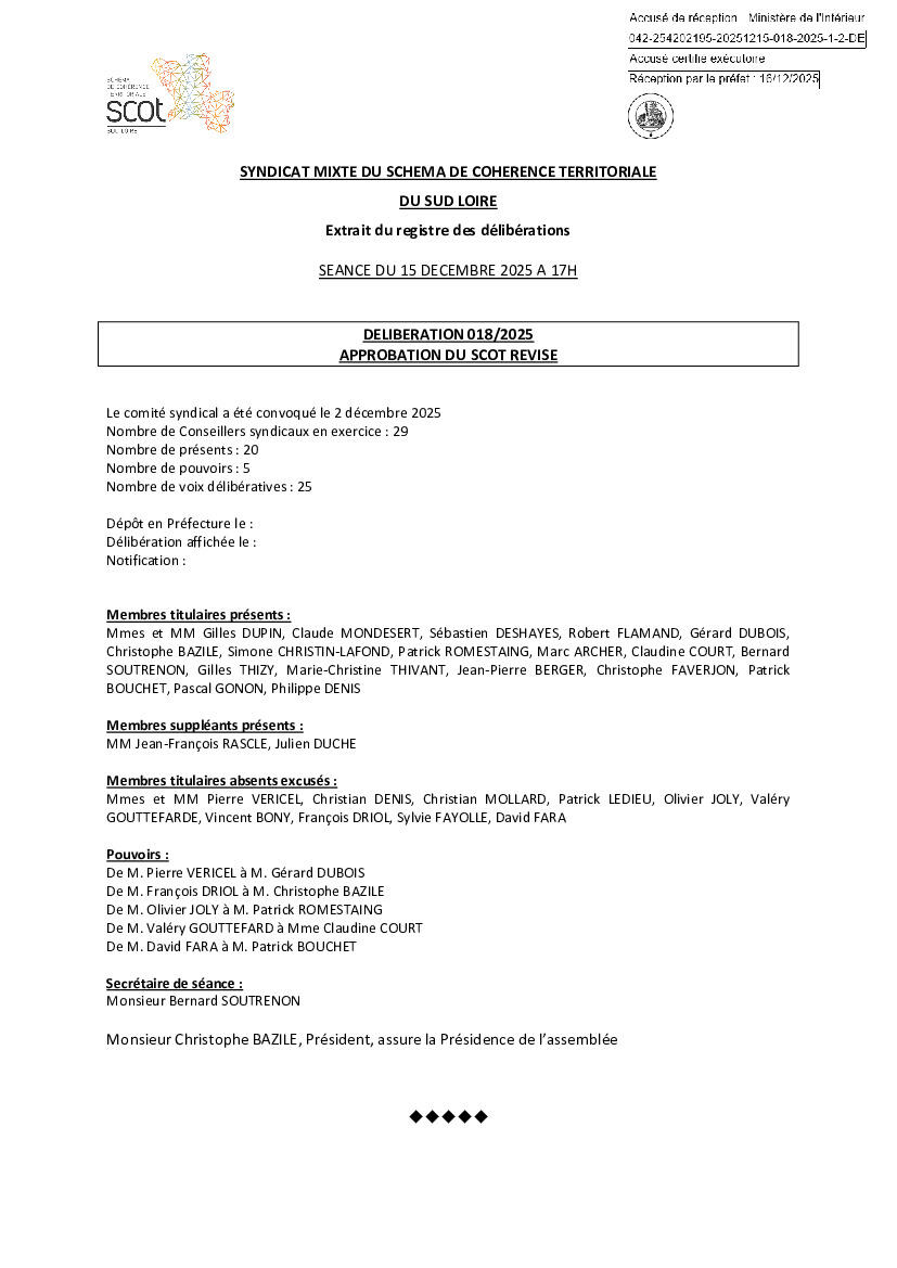 approbation du SCOT Loire Sud 24/12/25 le SCOT Sud Loire a été approuvé lundi 15 décembre 2025. Ci- joint les délibérations.