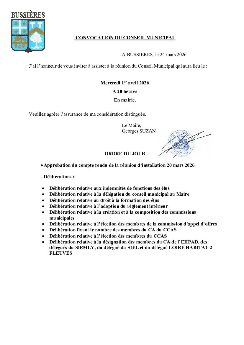 Convocation conseil municipal du 1er avril 2026 24/3/26 Ordre du jour de la prochaine réunion du conseil municipal.