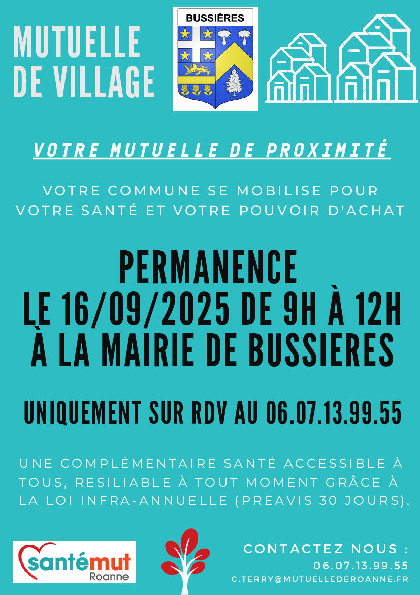 La mutuelle de village a pour objectif de permettre aux habitants de BUSSIERES de profiter de tarifs négociés en se regroupant et de mieux faire jouer les solidarités.  Elle est ouverte à tous sans limite d’âge, sans questionnaire de santé sans discrimination d’aucune sorte