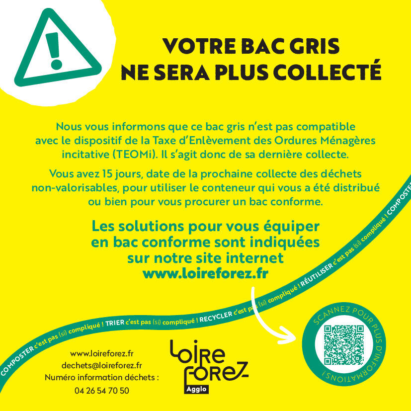 Dans le cadre du déploiement de la TEOMI, les nouveaux bacs gris dotés d'une puce et référencés par Loire Forez ont été distribués. A partir du 3 juin, seuls ces bacs seront ramassés. Les bacs gris non pucés ne seront plus collectés, une information sera collée sur les bacs concernés.