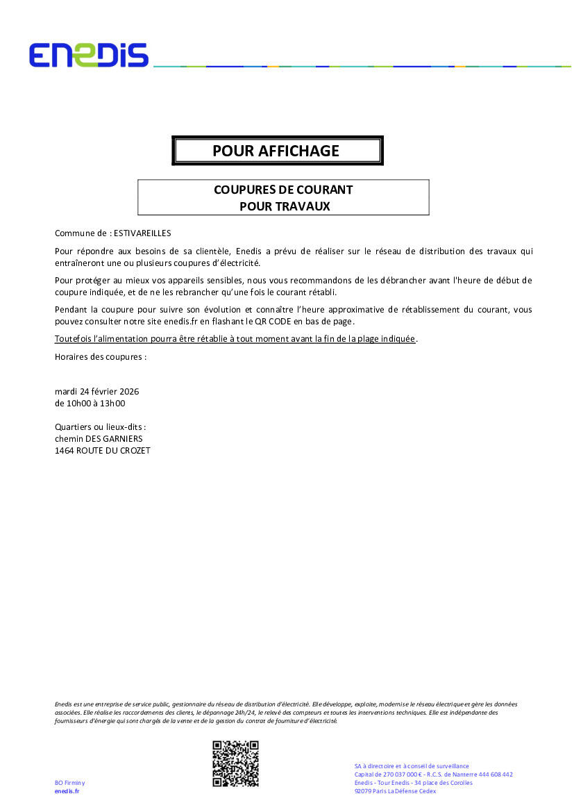 COUPURE DE COURANT 24/02 CHEMIN DES GARNIERS 10H à 13H