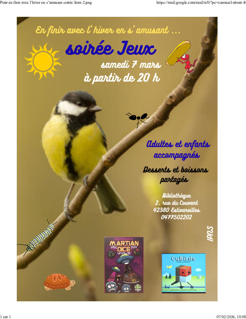 Ensuite  pour "en finir avec l'hiver en s'amusant " , vous pouvez noter la  soirée jeux le samedi 7 mars à partir de 20h,!