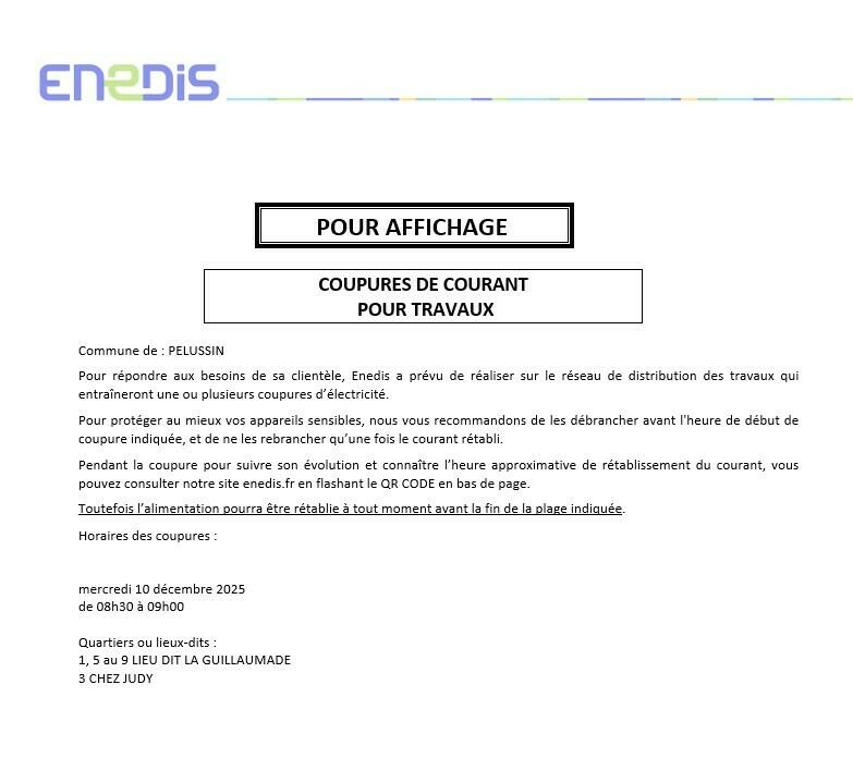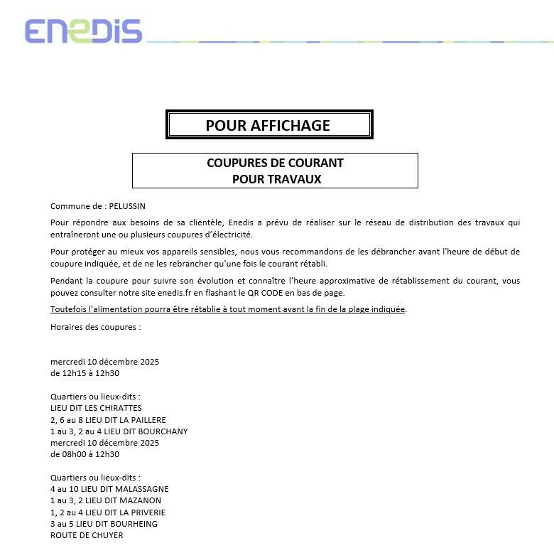 Enedis nous informe de coupures d'électricité en raison de travaux sur le réseau de distribution le :