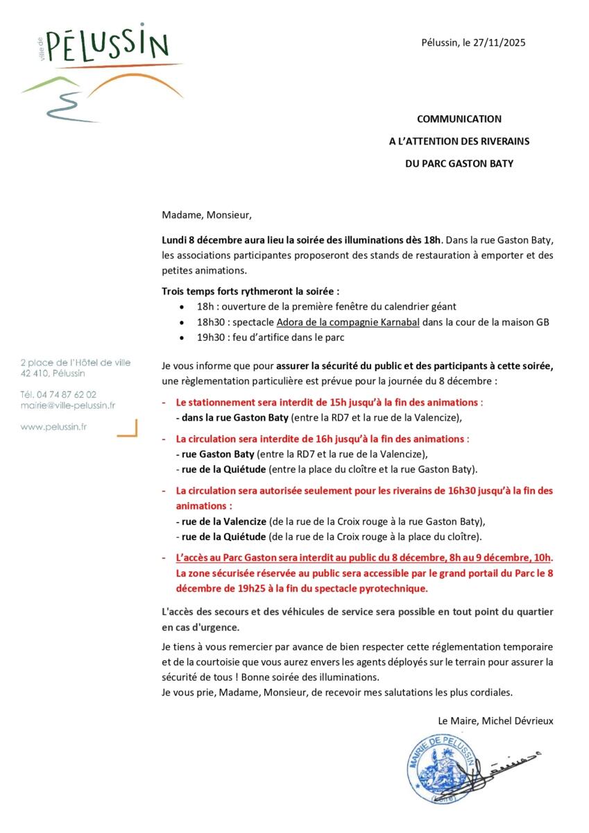 - Soirée des illuminations du lundi 8 décembre : Arrêté municipal n°2025_246 - courrier distribué aux riverains mercredi matin en image jointe