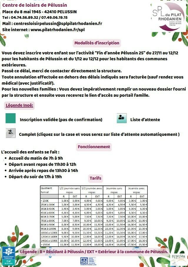Contact : 07 49 06 19 15 / 04 74 56 89 32 / centresloisirpelussin@splpilatrhodanien.fr