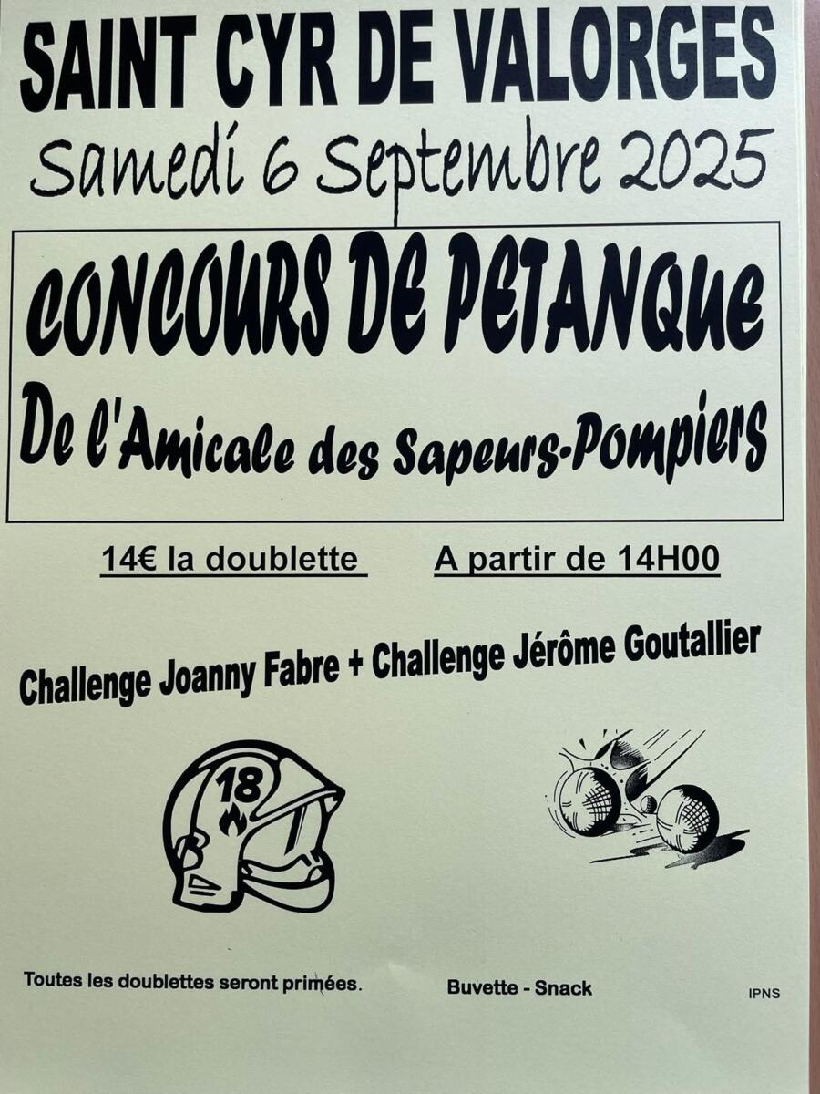 L’amicale des sapeurs-pompiers de St Cyr de Valorges vous donne rendez-vous samedi prochain 6 septembre à partir de 14 heures pour leur concours de pétanque en doublettes.