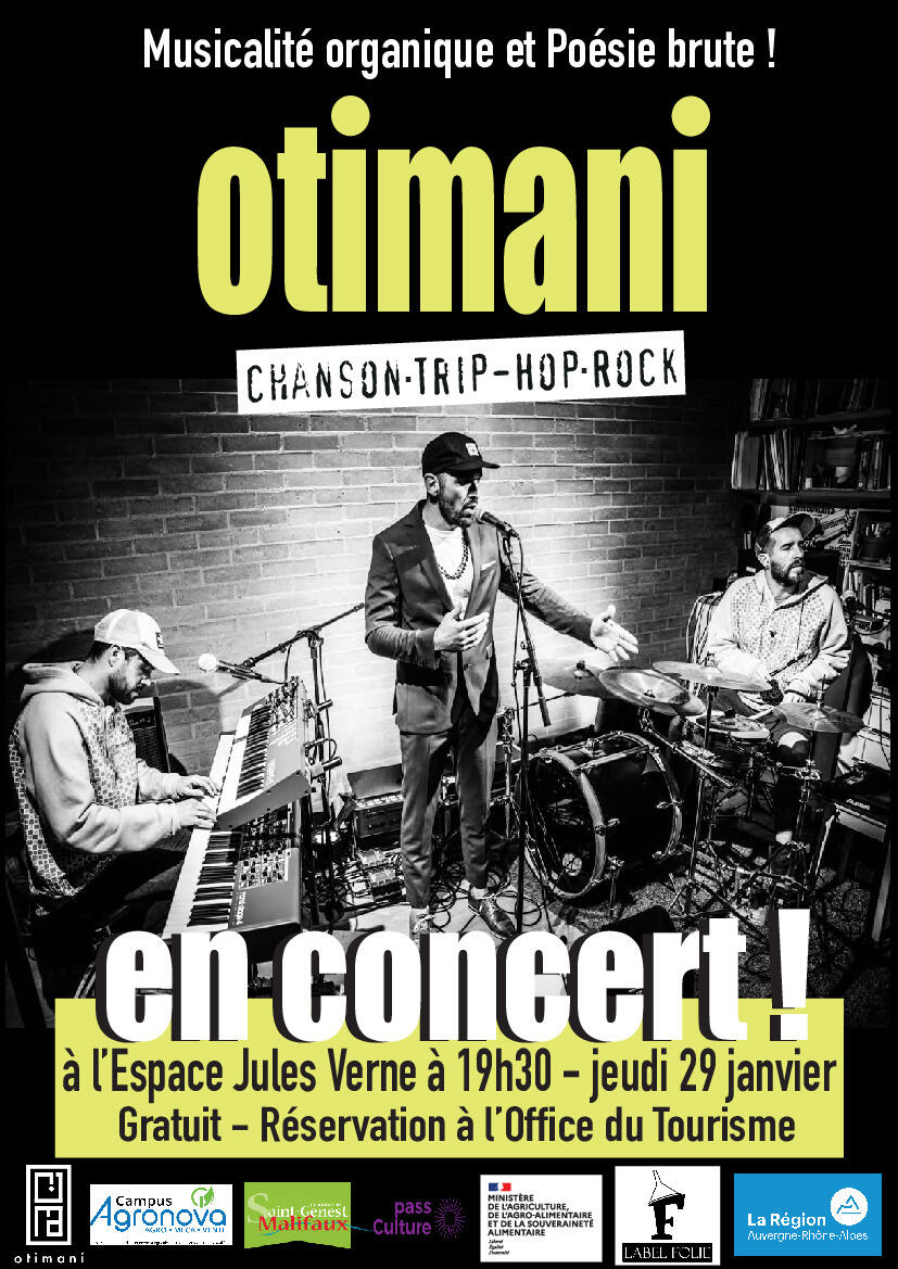 Le jeudi 29 janvier 2026, à partir 19h30 (heure d'ouverture des portes), se tiendra le concert d'Otimani et la représentation des élèves de TTCVA du Campus Agronova à l'Espace Jules Verne.