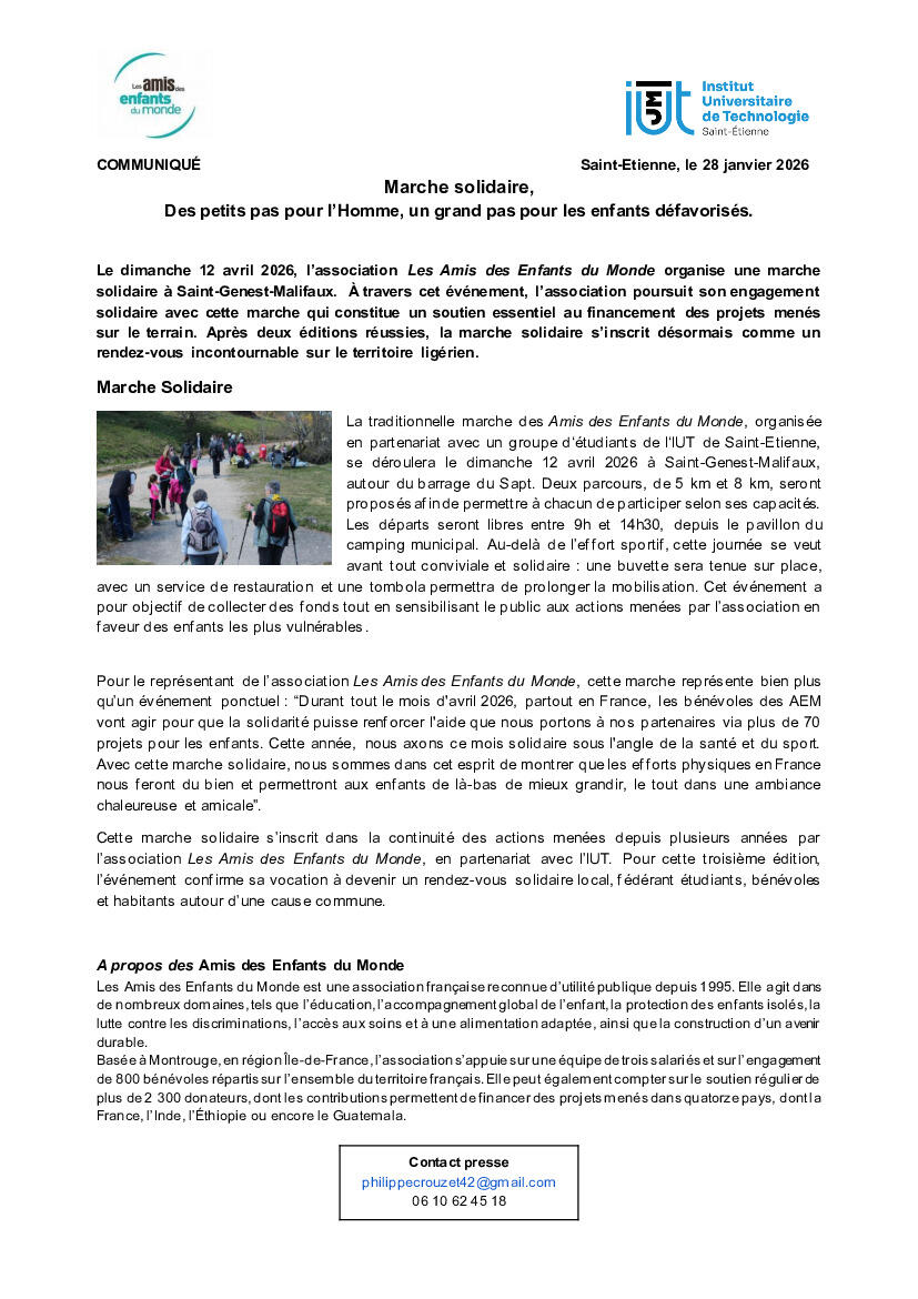 Une marche solidaire au profit de l’association Les Amis des Enfants du Monde se déroulera le dimanche 12 avril 2026 à Saint-Genest-Malifaux.