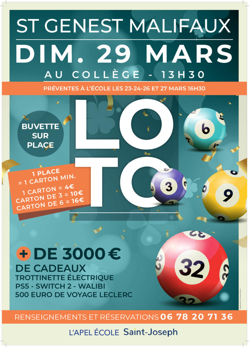 Les préventes pour le loto auront lieu les 23, 24, 26 et 27 mars de 16h20 à 18h dans la cour de l'école st joseph.