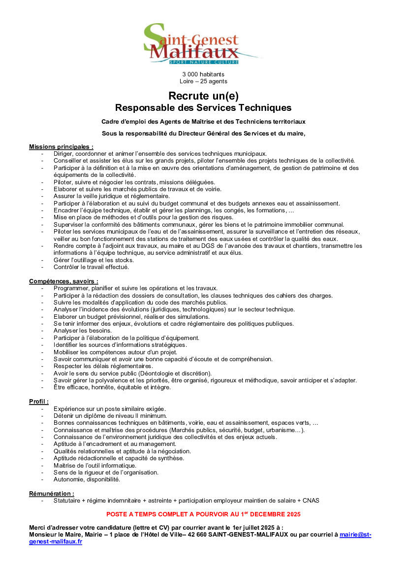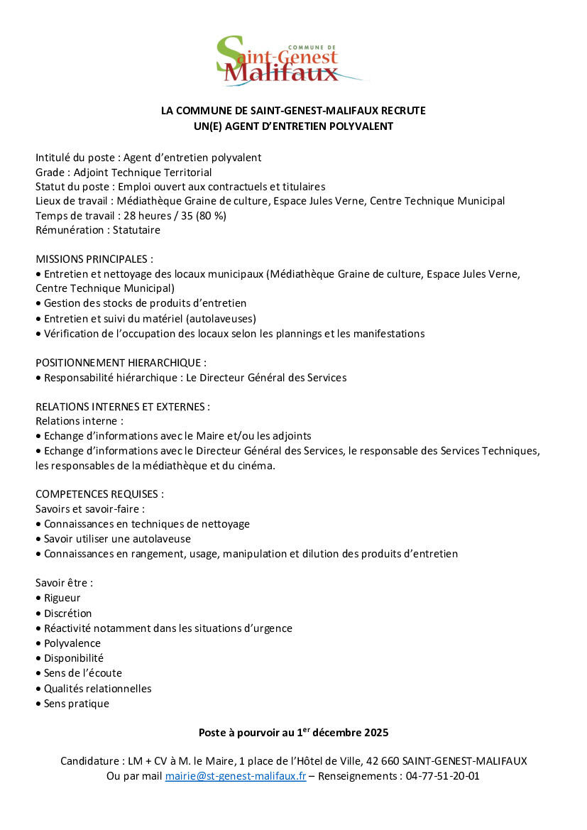La mairie de Saint-Genest-Malifaux recherche deux agents:
