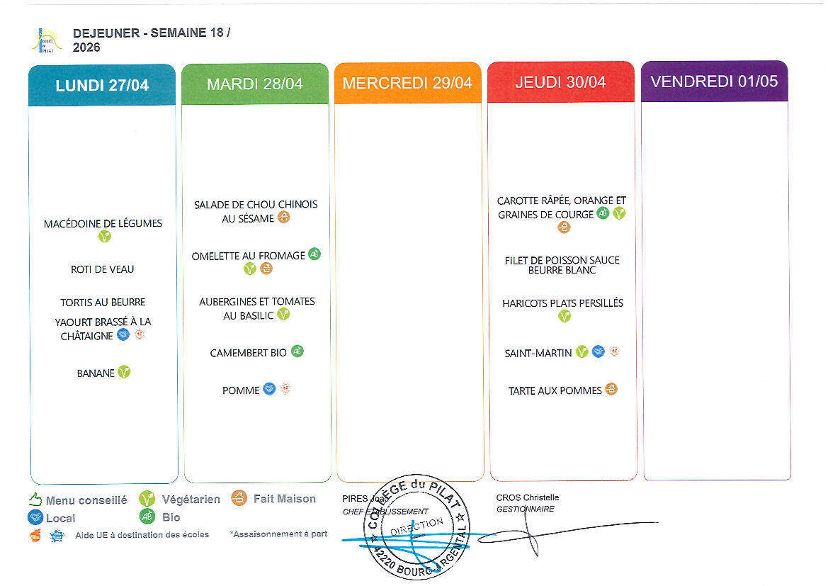 Menu du 27 au 30 avril 2026