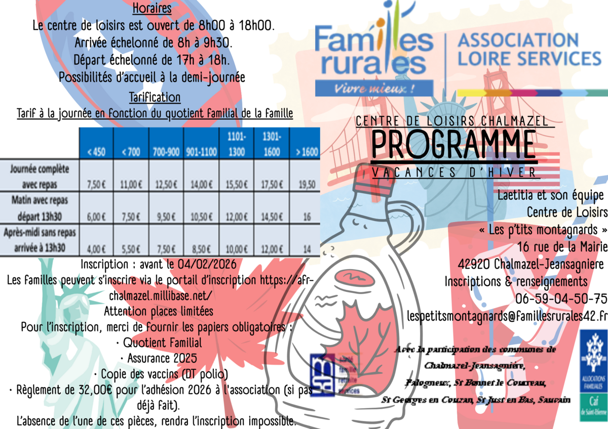 Les inscriptions seront ouvertes à partir de mercredi 14/01/2026 sur le lien suivant : https://afr-chalmazel.millibase.net/