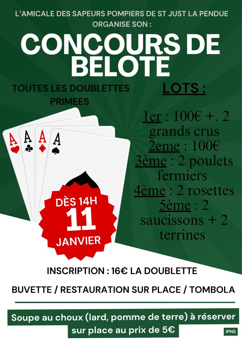 L'amicale des sapeurs pompiers vous attend dimanche 11 janvier à partir de 14h pour son concours de belote.