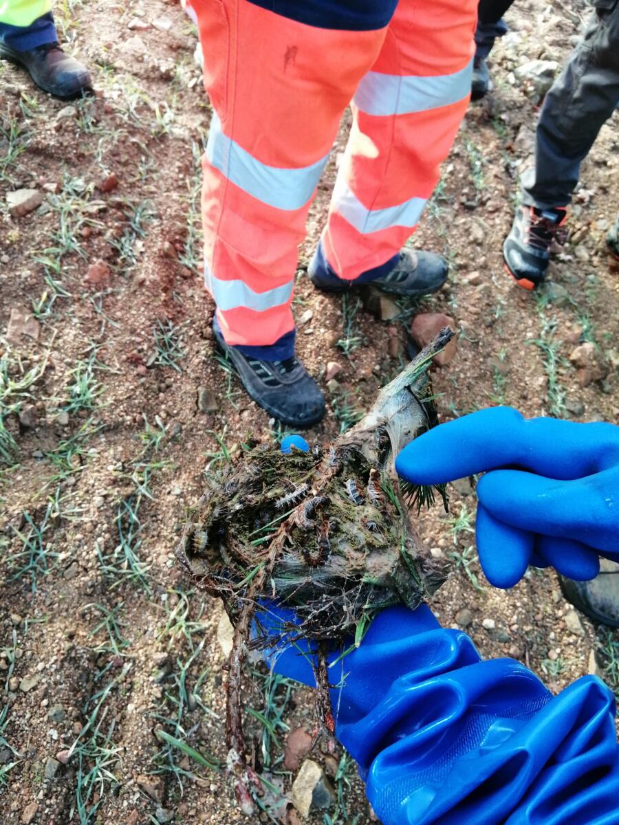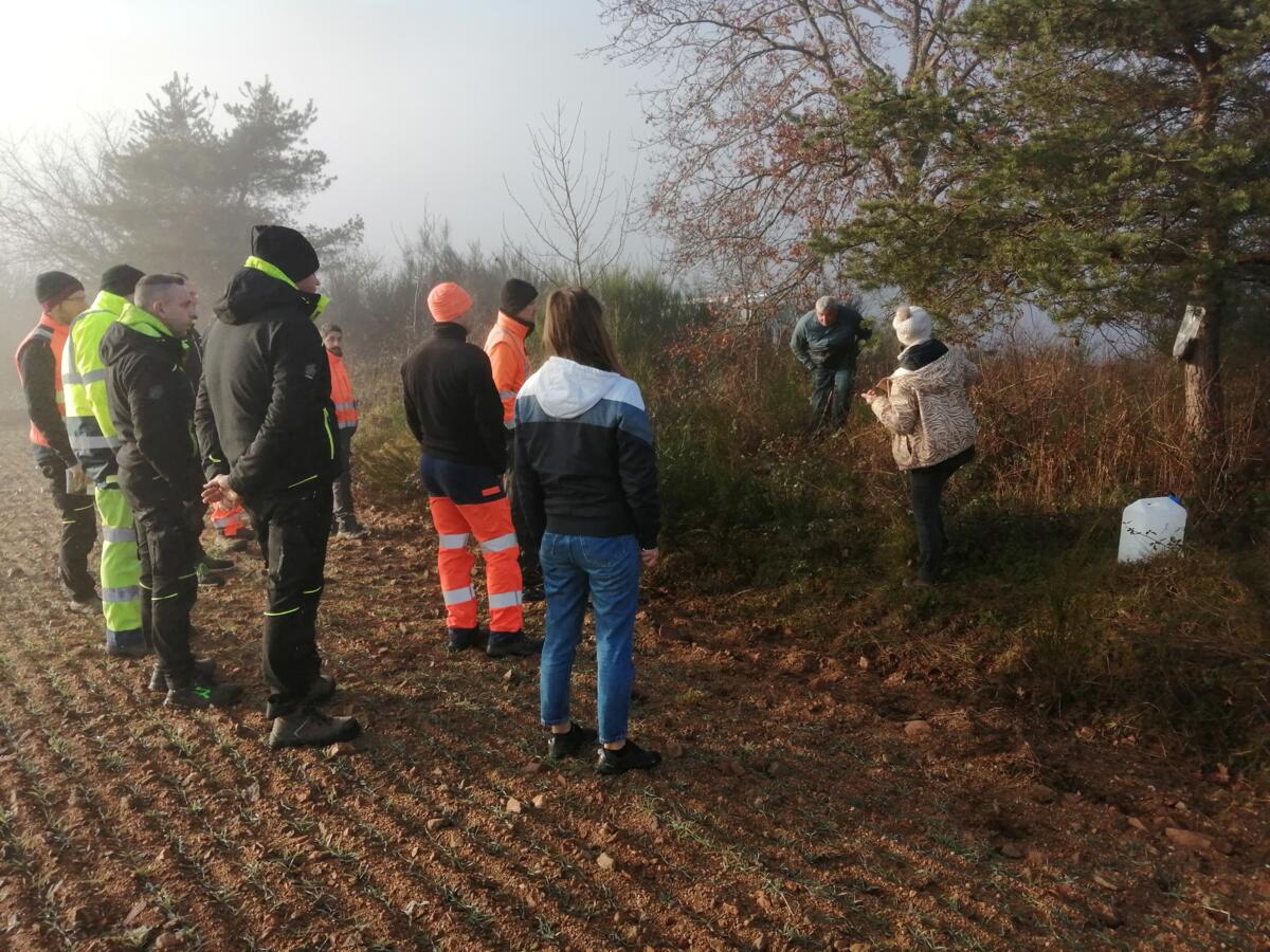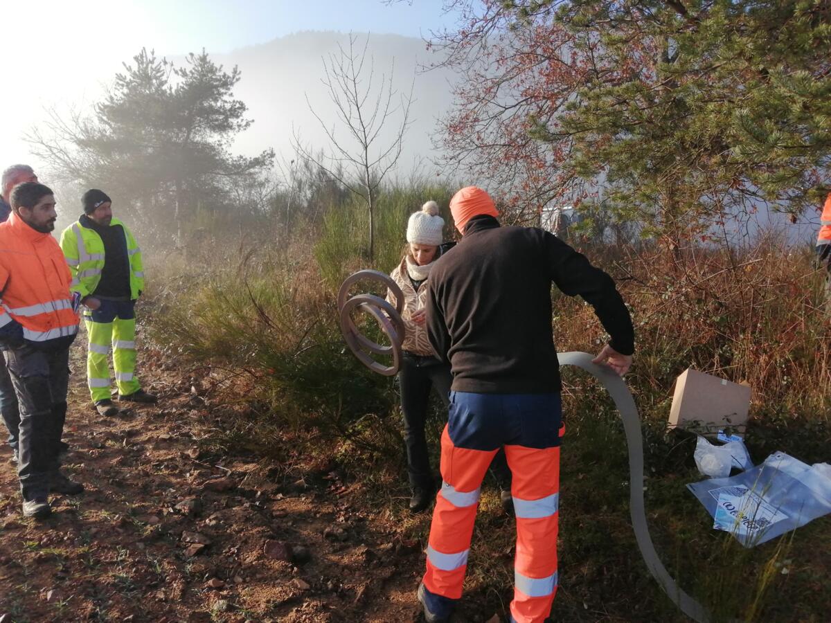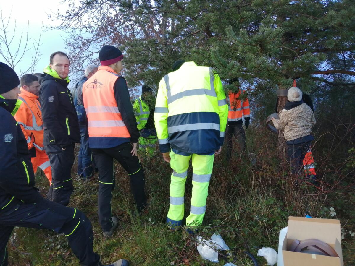 Quelques agents et élus de la Copler Communaute de Communes et de la Communauté de Communes des Vals d'Aix et Isable se sont reunis ce Jeudi 15 Janvier matin sur la Base Nautique de Cordelle pour assister à une démonstration de pose d'un eco piège contre les chenilles processionnaires.