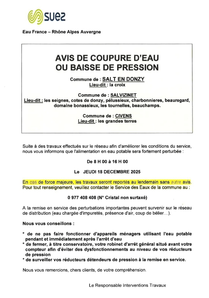 Suez nous informe d'une coupure d'eau :
