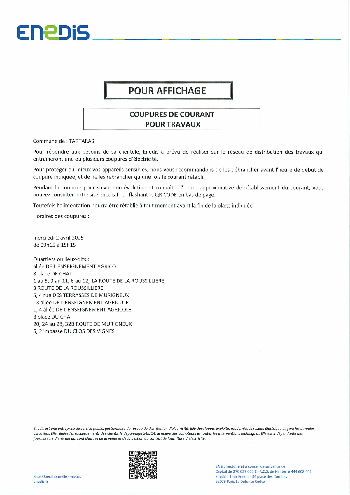 Coupure de courant - mercredi 2 avril 26/3/25 Mercredi 2 avril 2025 entre 9h15 et 15h15 Secteur concernés ci-dessous :