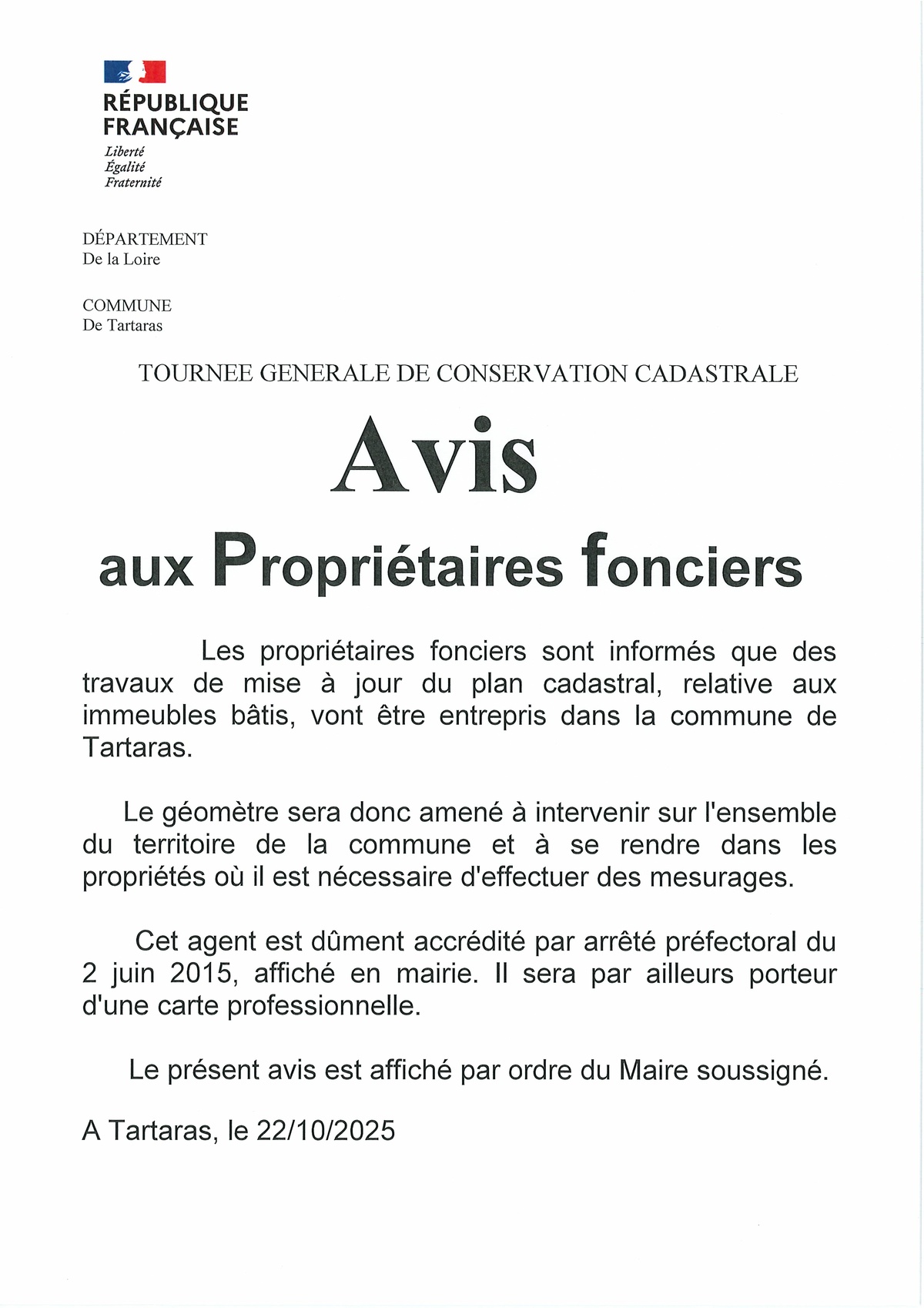 Dans le cadre de la mise à jour du plan cadastral, une tournée de conservation cadastrale sera effectuée sur l'ensemble du territoire de la commune à partir du 7 octobre 2025.