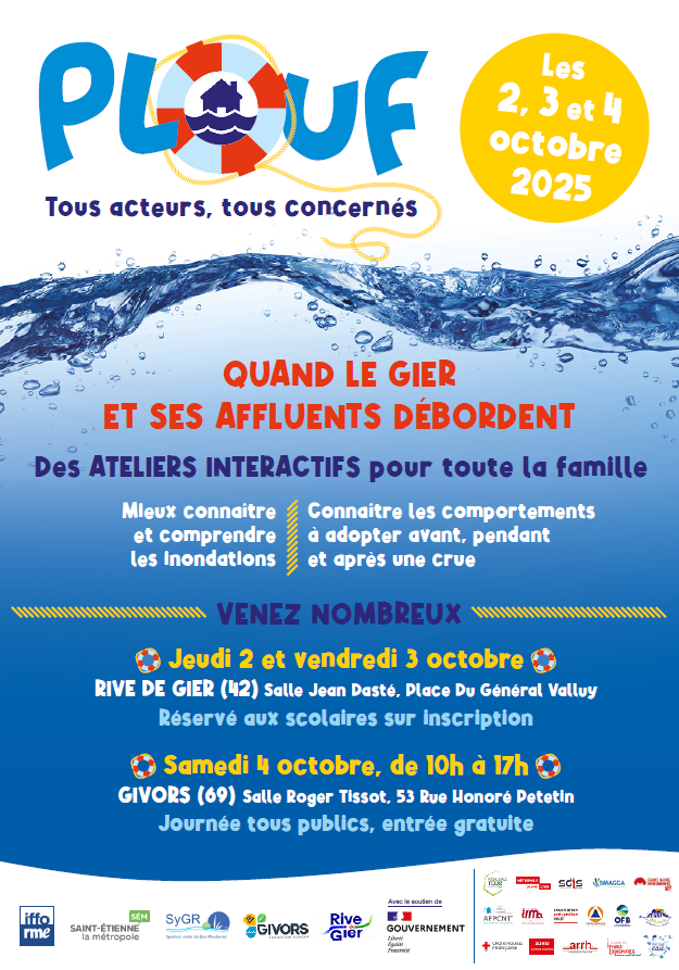 Dans le cadre du Programme d’Actions de Prévention des Inondations (PAPI) Gier, Saint-Etienne Métropole et le Syndicat mixte du Gier Rhodanien organisent, en partenariat avec l’Institut Français des Formateurs Risques Majeurs et protection de l’Environnement,un village-forum de sensibilisation aux inondations du Gier et de ses affluents, appelé PLOUF.