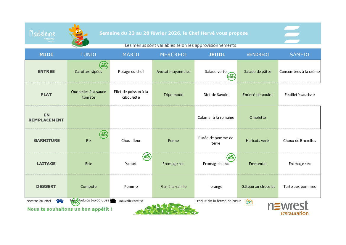 Menus du 23 février au 28 février 2026