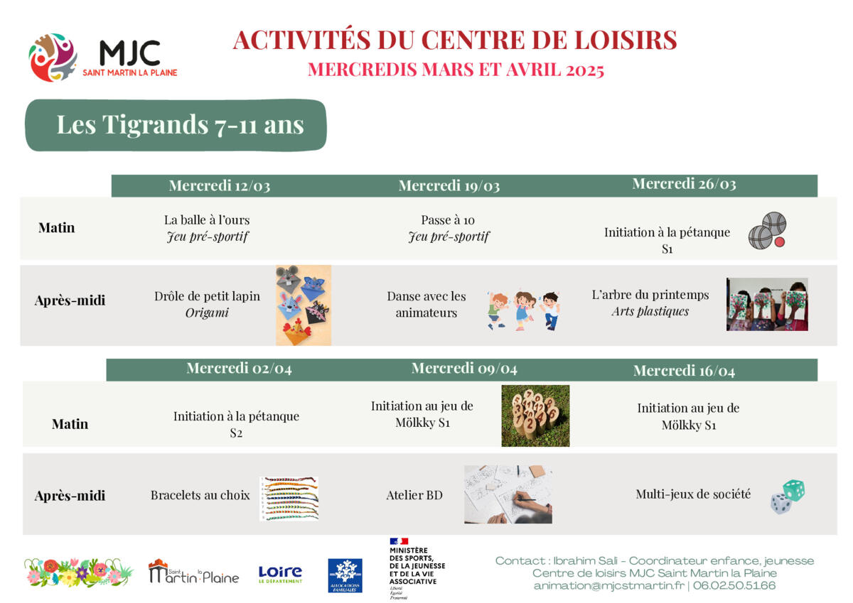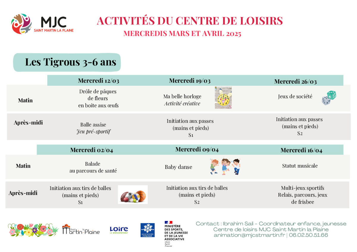 Centre de loisirs programme mercredis 19/3/25 Programme Tigrous et Tigrands - Les mercredis de mars-avril au centre de loisirs