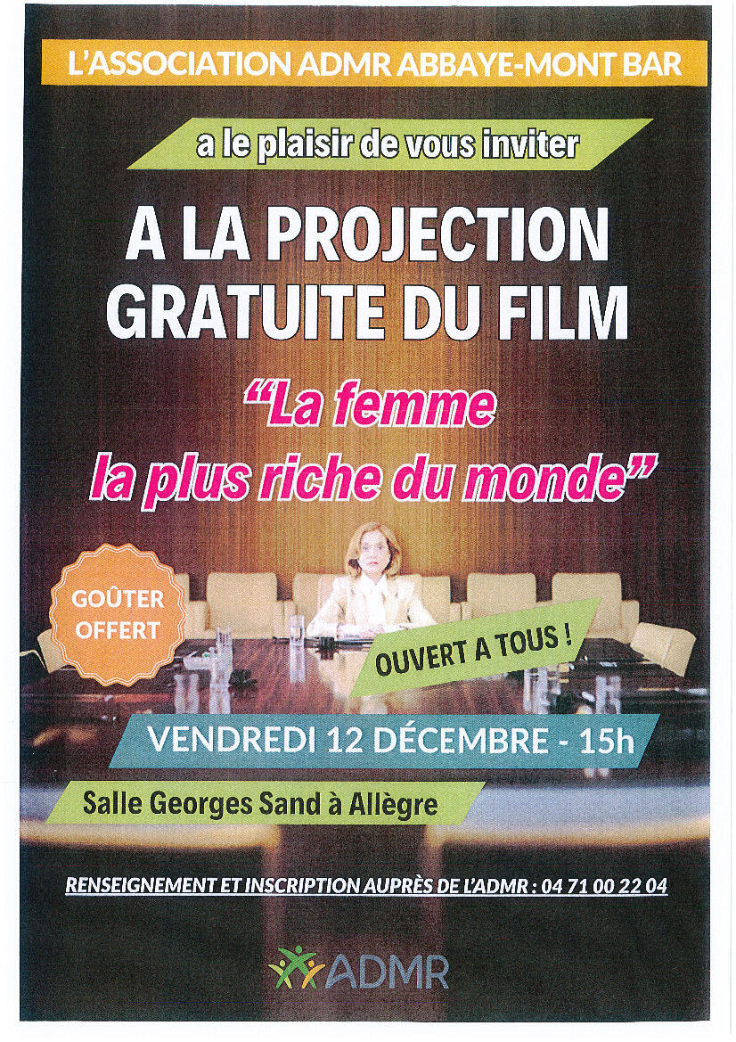 Projection gratuite d’un film suivie d’un goûter, 12/12, 15h